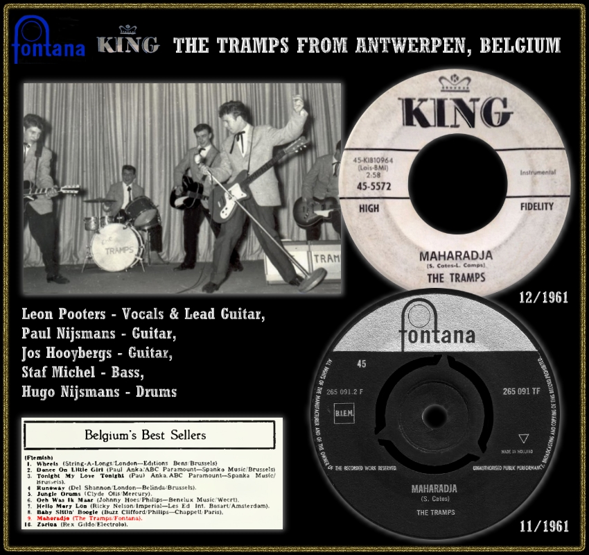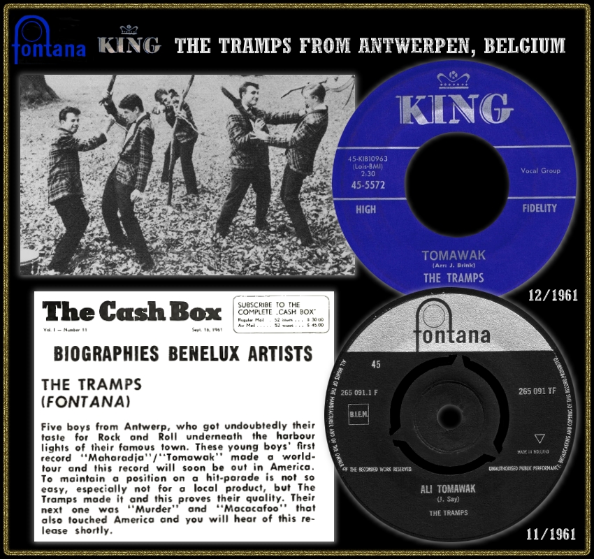 In letzter Zeit wurden sehr viele europäische Instrumental-Gruppen vorgestellt. Ich möchte mich der Vorstellungsserie anschließen und präsentiere die Tramps aus dem belgischen Antwerpen. Ich kannte diese Formation nicht aus meiner Jugendzeit sondern hatte sie erst auf der Sampler-LP-Serie "I'll Remember" mit dem Titel "Murder" kennengelernt. Der Titel gefiel mir so gut und darum hoffte ich, dass er zeitmäßig (bis 1962) in meine Sammlung passte. Ohne Internet war das seinerzeit nicht so einfach aber mit meinen Computer-Aufzeichnungen konnte ich einige Tramps finden (dieser Gruppenname wurde ja sehr häufig verwendet). Beim KING-Label in den USA wurde ich fündig und da ich zu diesem Zeitpunkt bereits beide Singles der Tramps besaß konnte ich nach Titelvergleich die Veröffentlichungszeit mit 1961 eruieren: