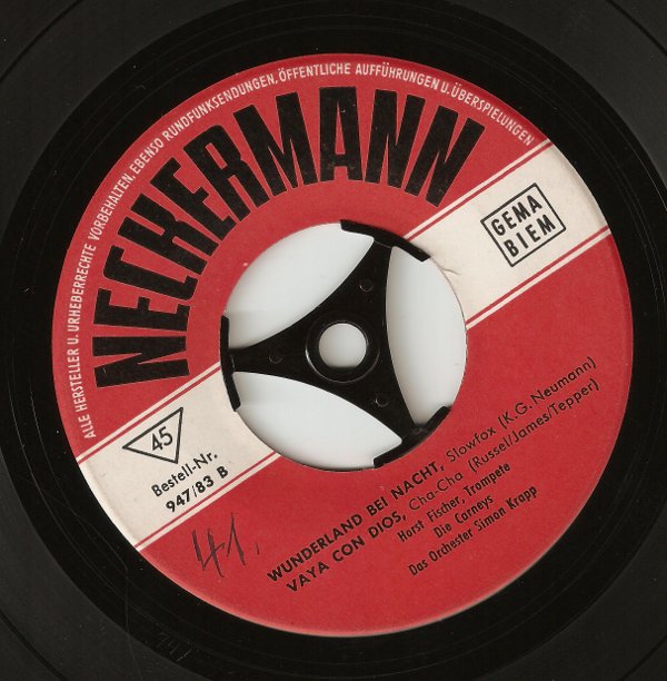 Weil ich neugierig bin wende ich mich an dich als kompetentesten Fachmann in dieser Sache. Wie die Parallelität zwischen AKKORD und FAVORIT besprochen wurde, bin ich noch viermal auf die Kombination "Wunderland bei Nacht"/"Blueberry Hill", allerdings zum Teil mit anderen Interpreten-Namen, gestossen (die Label-Reihung ist nur alphabetisch):
