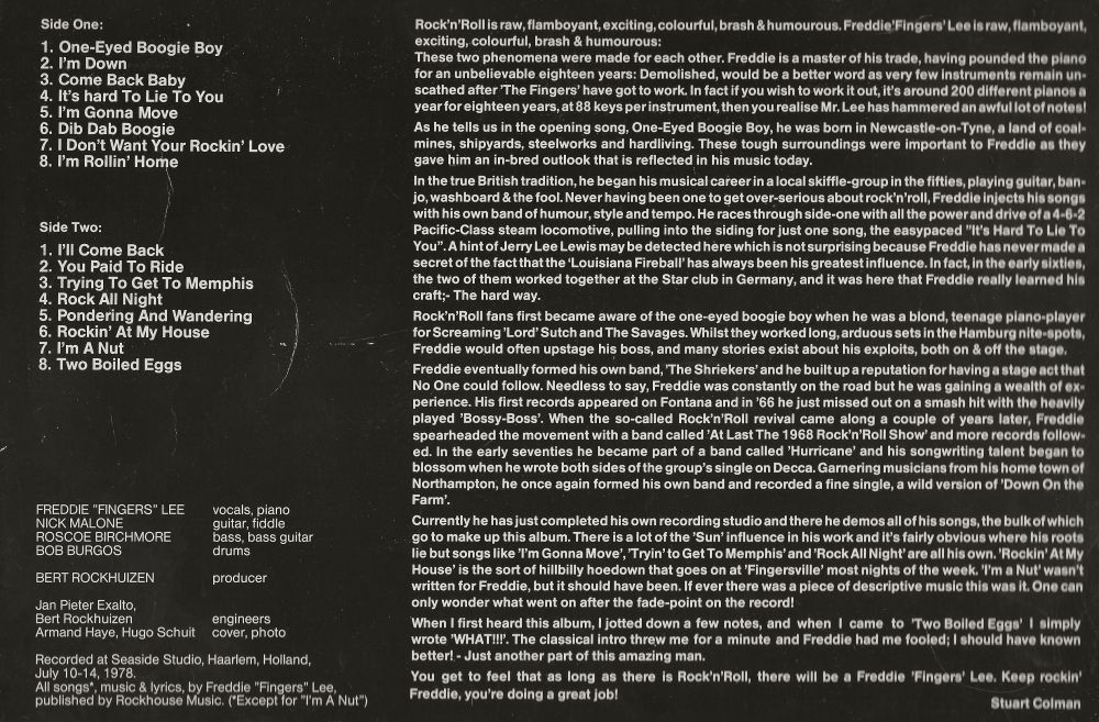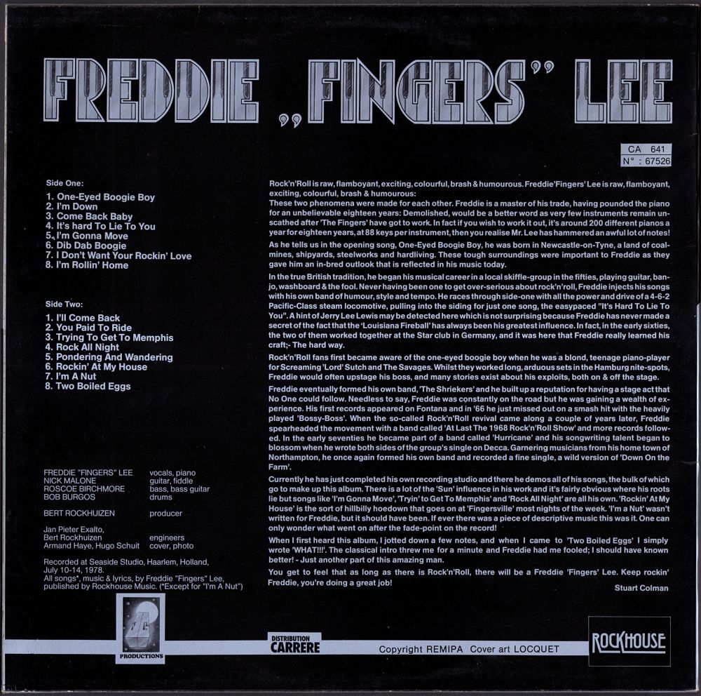 Rock’n’Roll ist roh, extravagant, aufregend, farbenfroh, frech und humorvoll. Freddie "Fingers" Lee ist roh, extravagant, aufregend, farbenfroh, frech und humorvoll: Diese beiden Phänomene sind wie füreinander geschaffen. Freddie ist ein Meister seines Fachs und hat unglaubliche achtzehn Jahre lang Klavier gespielt – man könnte fast sagen, er hat es fast zerstört, denn nur wenige Instrumente bleiben unbeschädigt, nachdem die Fingers losgelegt haben. Um es mal auszurechnen: Das sind rund 200 verschiedene Klaviere pro Jahr, achtzehn Jahre lang, bei 88 Tasten pro Instrument. Da wird einem erst bewusst, wie viele Noten Mr. Lee in die Tasten gehämmert hat!