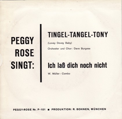 Ein Flohmarkt-Fundstück möchte ich hier präsentieren, welches mich besonders freut. Es ist das erste Exemplar des „PEGGY“-Labels, dass ich jemals sah und auch von der Sängerin PEGGY ROSE. Man könnte annehmen, dieses Label wäre extra für sie gegündet worden. Noch verwunderlicher ist der Name des Orchesters und Chores, die bei dieser Aufnahme mitgewirkt haben. Von DAVE BURGESS, dem Ex-Champs-Mitglied stammt nämlich auch das amerikanische Original. (…und der begleitet-wenn´s stimmt-mit seinen Leuten eine deutschsprachige Cover-Version seines eigenen Liedes!?!?!... sehr sonderbar.)