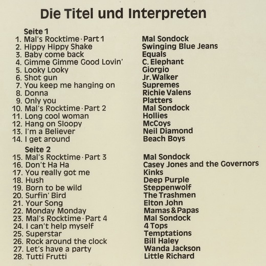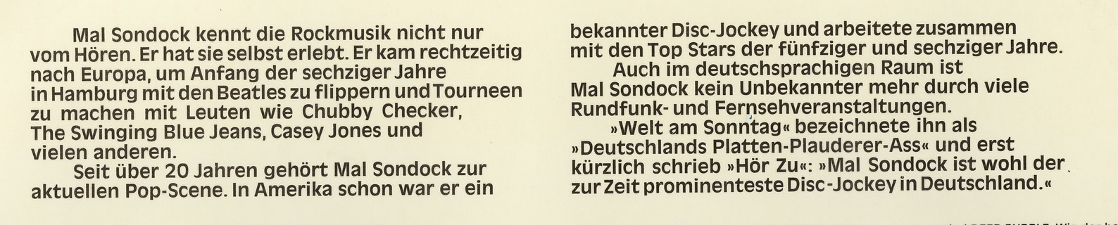 SONDOCK, MAL (MALCOLM) * 04.07.1934 in Houston/Texas, + 09.06.2009, amerikanischer Sänger, Rundfunk-Moderator, Produzent, als 13 jähriger beginnt er mit dem Unterricht auf dem Saxophon, als 16 jähriger arbeitet er in Oklahoma-City erstmals als Disc-Jockey, in Oklahoma-City u. Los Angeles Besuch der Universität, zunehmende Aktivitäten in der Show-Branche: Agent, Programmgestalter bei Rundfunkstationen, Schallplattenproduzent, Mitglied in einer Hill-Billy-Band, 1957 Einzug zum Militär, als GI in Deutschland, Oktober 1957-Mai 1959 DJ beim AFN-Munich (beliebte Sendung war "Bouncing in Bavaria"), ab Sommer 1959 "Record Hop"-Teenager-Tanzparty, in Holland Gewinner im Discjockey-Poll, 1959 TV-Sendungen "Made in USA", ab 1960 beliebter DJ beim WDR in Köln, Journalist für das US-Musikfachblatt Cashbox, Schlagersänger, 1959 als JOHN MILLER auf Starlet, Philips ("Gemütlichkeits Cha-Cha"), 1960-66 Polydor (u.a. "Das Mädchen Mit Dem Traurigen Blick"/"Texas Cowboy Und Mexico Girl"-1964, "Juanita Banana"), 1961/63 Columbia (u.a. Hit "Hey Annabella Susann", "Traum", "Ich Hab’ Kein Geld" & Die TEXANER), Gloria, 1965 auf Hansa CONTINENTAL BROTHERS (DRAFI & MAL SONDOCK), Komponist, Textautor, Produzent u.a. bei den MISSOURIS, MICHAEL HOLM, WYN HOOP (1960/61), Filme "Stadt Ohne Mitleid (Town Without Pity)"-1961, "Verspätung In Marienborn"-1963, "Der Chef Wünscht Keine Zeugen"-1963, ""Die Lustigen Weiber Von Tirol"-1964, 1970 Ariola 10281 als J & M (mit Johnny Tame alias Uwe Reuss), in den 80ern Rollende Discothek, heute vertreibt er musikalische Werbegeschenke, Buch "1000 Nadelstiche", CD auf bear family records