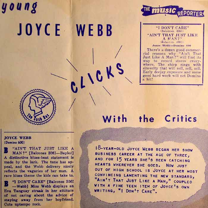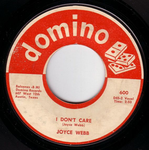 Ich habe den 16. Juni 2009 zum Damentag erklärt. Außerdem gibt es das altbekannte Sprichwort "Alle guten Dinge sind drei". Hier nun die dritte Dame in dieser Reihe - nach Opal Jean und Odetta - Joyce Webb. Viel gibt es auch von ihr nicht zu erzählen. Bei DOMINO hat sie zum Hintergrundchor von Ray Campi gehört und wurde auch bei einer ihrer zwei Solo-Singles bei DOMINO von Ray Campi's Band begleitet. Viel mehr konnte ich nicht eruieren.
