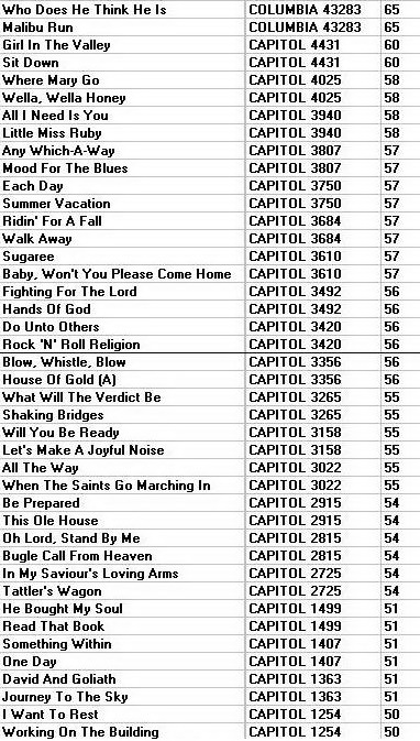 Ihre Backing-Arbeit trug weiterhin Früchte bei Interpreten wie Jim Reeves, Marty Robbins, Waylon Jennings, Johnny Horton, Ferlin Husky, Tammy Wynette, Kenny Rodgers, Tennessee Ernie Ford, Dolly Parton, Red Foley, Willie Nelson, George Jones, Steve Lawrence und Eydie Gormé, Connie Francis, Johnny Hallyday und Julie Andrews, Ricky Nelson (Poor Little Fool", "Lonesome Town", "It's Late", "Travelin' Man"), Jimmy Dean's "Big Bad John", Loretta Lynn's "Coal Miner's Daughter", Patsy Cline's "Crazy", Conway Twitty's "It's Only Make Believe" oder Johnny Horton's "Battle of New Orleans", um nur einige wichtige zu nennen.