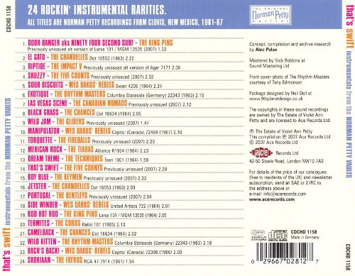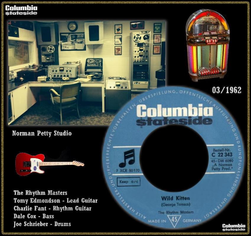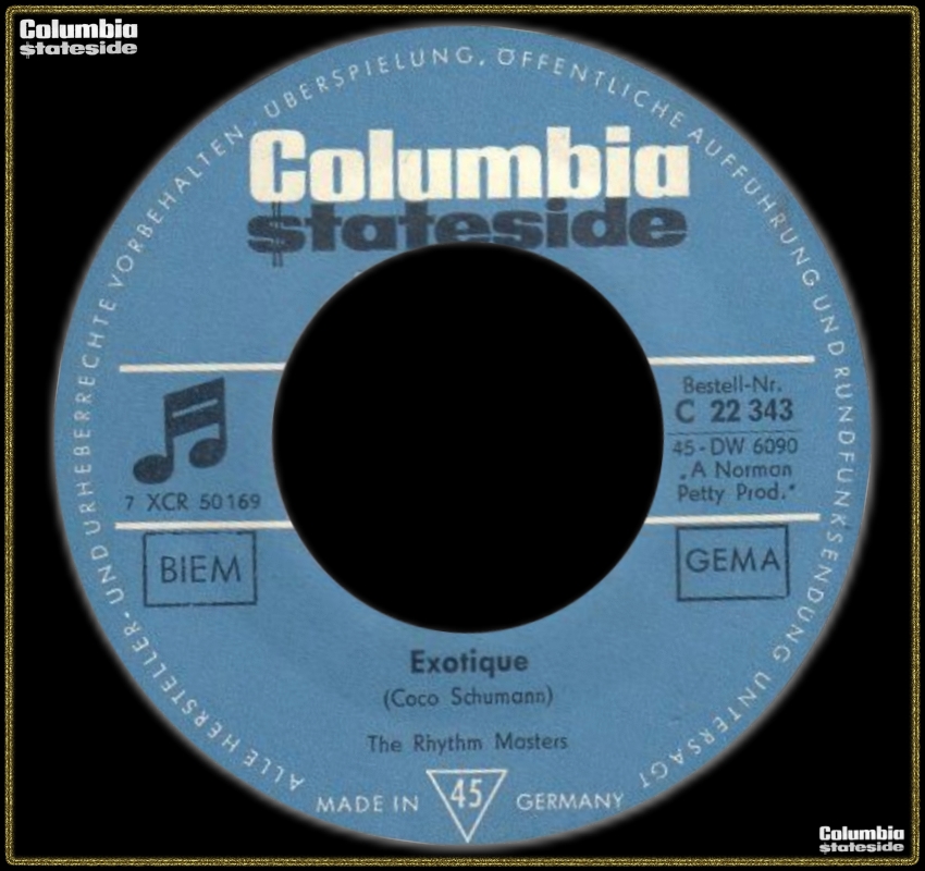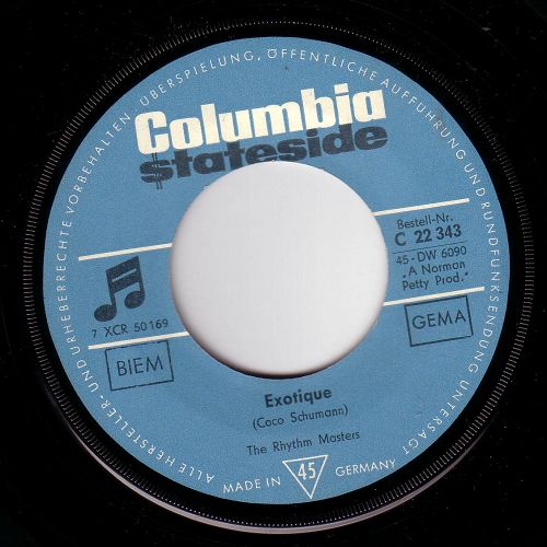 Norman Petty, geboren am 25. Mai 1927 in Clovis, New Mexico, gestorben an Leukämie am 15. August 1984 in Lubbock, Texas, war einer der größten Musik-Produzenten der Rocknroll-Zeit. Namen wie Roy Orbison, Buddy Knox, Buddy Holly und...und...und sind eng mit ihm verbunden. Auf instrumentalen Bereich war er auch als Norman Petty Trio tätig und die Fireballs sind sicher für jeden ein Begriff. Aber für wen sind The Rhythm Masters ein Begriff? Norman Petty streckte seine Produzentenhände sogar bis Deutschland aus, wo er "Exotique", eine Komposition des bekannten Jazzmusikers und Gitarristen Jakob "Coco" Schumann, geboren am 14. Mai 1924 in Berlin, produzierte. Dafür engagierte er The Rhythm Masters die es vermutlich garnicht gibt. Es dürfte sich um deutsche Studio-Musiker handeln. Ob Coco Schumann mit seiner Gitarre auch dabei war, entzieht sich leider meiner Kenntnis. Der B-Seiten-Titel stammt von George Tomsco, der sicher den Meisten von den Fireballs bekannt ist. Sicher ist eines, diese Single gab es weder in den USA noch in Großbritannien, sondern nur bei uns. Wenn einer von euch Daten über die Aufname-Session dieser Titel oder andere Infos dazu hätte, wäre das für's Forum sicher äußerst interessant.