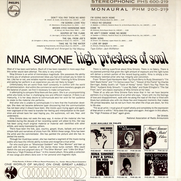 1957 veröffentlichte sie in New York ihr erstes Album auf Bethlehem Records, ein Konzert 1959 in der New York City Town Hall machte sie in den USA und in Europa bekannt. Von ihren Fans wurde sie ehrfürchtig als "Hohepriesterin des Soul" bezeichnet. In den 1960er Jahren engagierte sie sich in der US-amerikanischen Bürgerrechtsbewegung, mit Liedern wie "Mississippi Goddam" und "To be young, gifted, and black" (Liedtext von Weldon Irvine) wurde sie eine ihrer musikalischen Leitfiguren.
