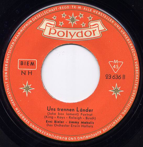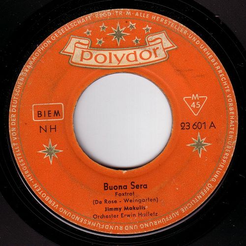 1958/1959 Polydor (u.a. "Buona Sera"-1958, "So Küssen Die Frauen In Peru"-1958, "Jingle Bell Rock"-1959 u. Duettaufnahmen mit ERNI BIELER-1958 u. LOLITA-1958 als JIMMY und LOLITA),