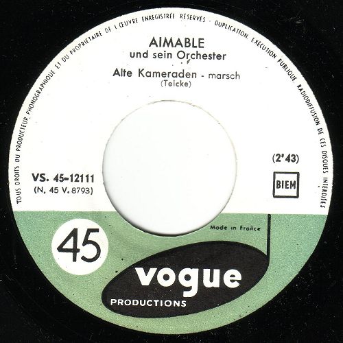 Seit spätestens 1959 gab es schon eine für den deutschsprachigen Raum konzipierte Nummernserie, nämlich VS. 12xxx, aber natürlich noch mit "Made In France". Die mir bekannten Singles dieser Serie sind durchwegs französische Instrumental-Produktionen. Diese Serie ist bei mir noch sehr lückenhaft aber ich kann mir so einen Zufall nicht vorstellen, dass ich ausgerechnet nur Instrumentalnummern "erwischte". Vermutlich haben die Franzosen tatsächlich eine eigene Nummernserie für den deutschsprachigen Raum installiert, die nur Orchestermusik aus Frankreich, wie zum Beispiel von Aimable, vorstellte