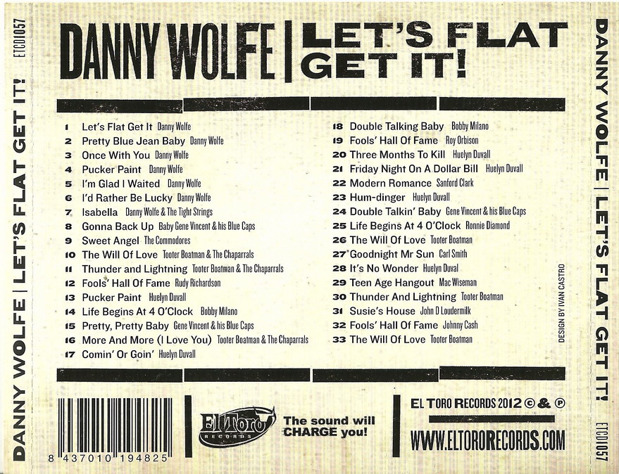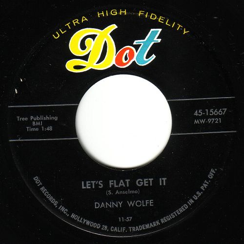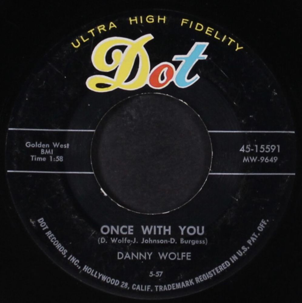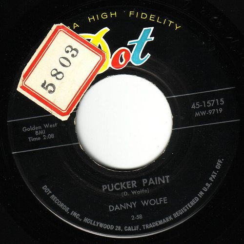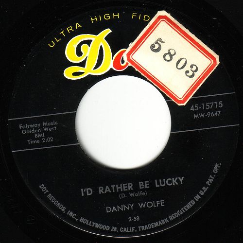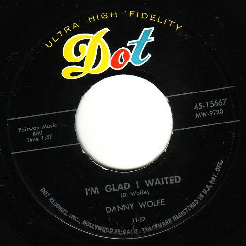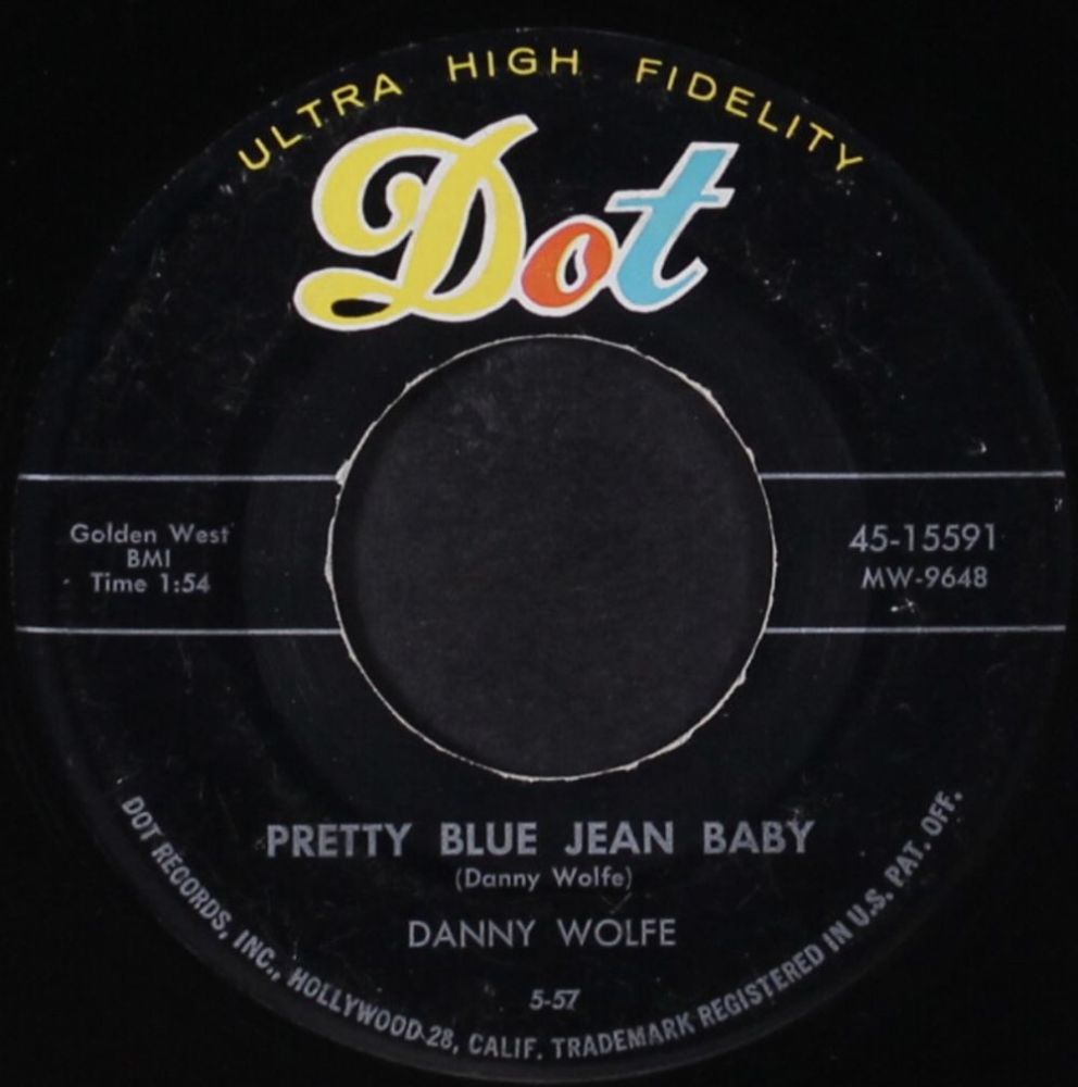 Danny Wolfe wurde 1936 als Sohn wohlhabender Eltern in Stephenville, Texas, geboren. Erst 60-jährig verstarb er 1996. Er interessierte sich schon sehr früh für die Musik, besonders in kompositorischer Hinsicht. 1957 förderte er Huelyn Duval, indem er ihm einen Vertrag mit CHALLENGE verschaffte und ihm seine Titel "Comin' Or Goin'", "Three Months To Kill" und "Pucker Paint" aufnehmen ließ. Da er sehr füllig und auch noch Brillenträger war hatte er Hemmungen, seine Songs selbst vorzutragen. 1957 schaffte er es aber doch in die Studios von DOT-Records und nahm drei Singles auf. Der ersten Single "Pretty Blue Jean Baby" / "Once With You" (DOT 15591) war wenig Erfolg beschieden. Die nächsten zwei ließen sich schon besser verkaufen und sind heute für Rockabilly-Fans ein Muß in der Sammlung (siehe Scans). Hier noch eine kleine Auswahl seiner bekanntesten Kompositionen: "Modern Romance" für Sanford Clark, "Susie's House" für John D. Loudermilk, "Life Begins At Four O'Clock" für Bobby Milano, "Gonna Back Up Baby", "Double Talkin' Baby" sowie "Pretty, Pretty Baby" für Gene Vincent, "Fool's Hall Of Fame" für Johnny Cash und so weiter. Sein größter kommerzieller Erfolg war wohl "Sugar Moon" für Pat Boone