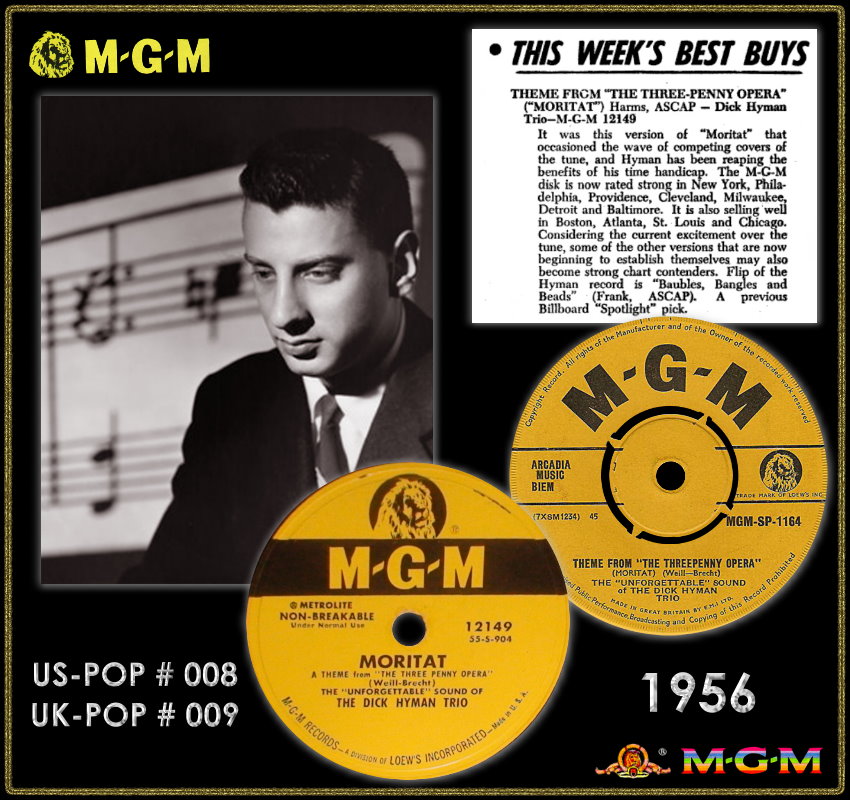 Mit Dick Hyman, * 08. März 1927 in New York, wird auf einen weiteren Instrumentalisten eingegangen, der mit seinem Trio und dem Titel “Theme From The Three Penny Opera (Moritat)“ Anfang 1956 ein Charts-Hit in US und UK (# 8/# 9) landen konnte. “A Theme From The Three Penny Opera (Mack The Knife)“ nach der Moritat “Die Dreigroschenoper“ von Bert Brecht und vertont von Kurt Weill war ein Titel, um deren gute Platzierung sich 1956 viele Interpreten in den US-Charts stritten: Dick Hyman Trio, Richard Hayman & Jan August (# 12), Billy Vaughn (# 53), Louis Armstrong (# 20), Les Paul (# 49), Lawrence Welk (# 31) und 1959 noch einmal Bobby Darin mit einer überaus erfolgreichen Gesangsversion (# 1 USA, # 1 UK) als “Mack The Knife“.