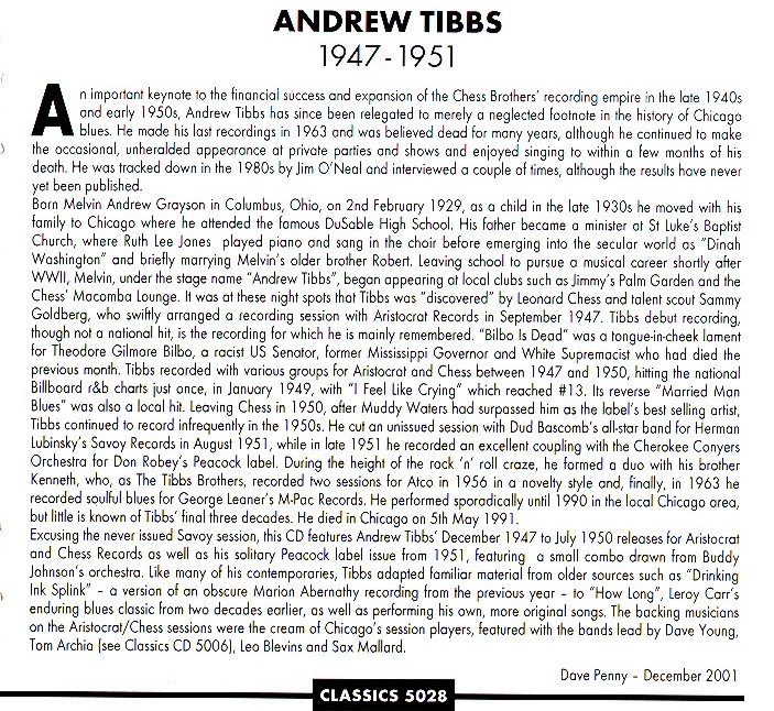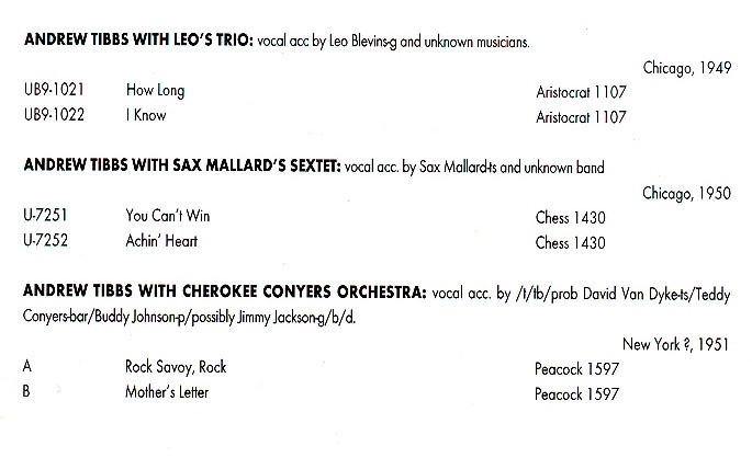 Andrew Tibbs war ein Tenor. Seine weiche Stimme und seine warmherzige Art täuschten darüber hinweg, dass er in Wirklichkeit sehr abenteuerlustig und vergnügungssüchtig war. ,,Ich hab nie was anbrennen lassen“, sagte er des Öfteren. „Ich wollte einfach meinen Spaß haben.“ Goldberg interessierte sich so sehr für Tibbs, dass er ihn ins Macomba brachte und Leonard vorstellte. Die beiden verstanden sich gut, und Tibbs sang schließlich zwischen seinen Sets im Jimmy's in der Lounge von Leonard Chess. Darüber hinaus erwies er sich als Katalysator für Leonards Vordringen ins Plattengeschäft.