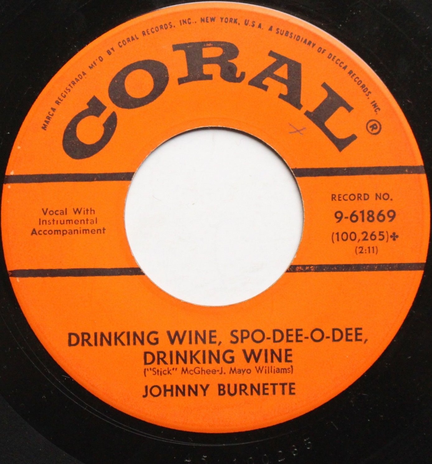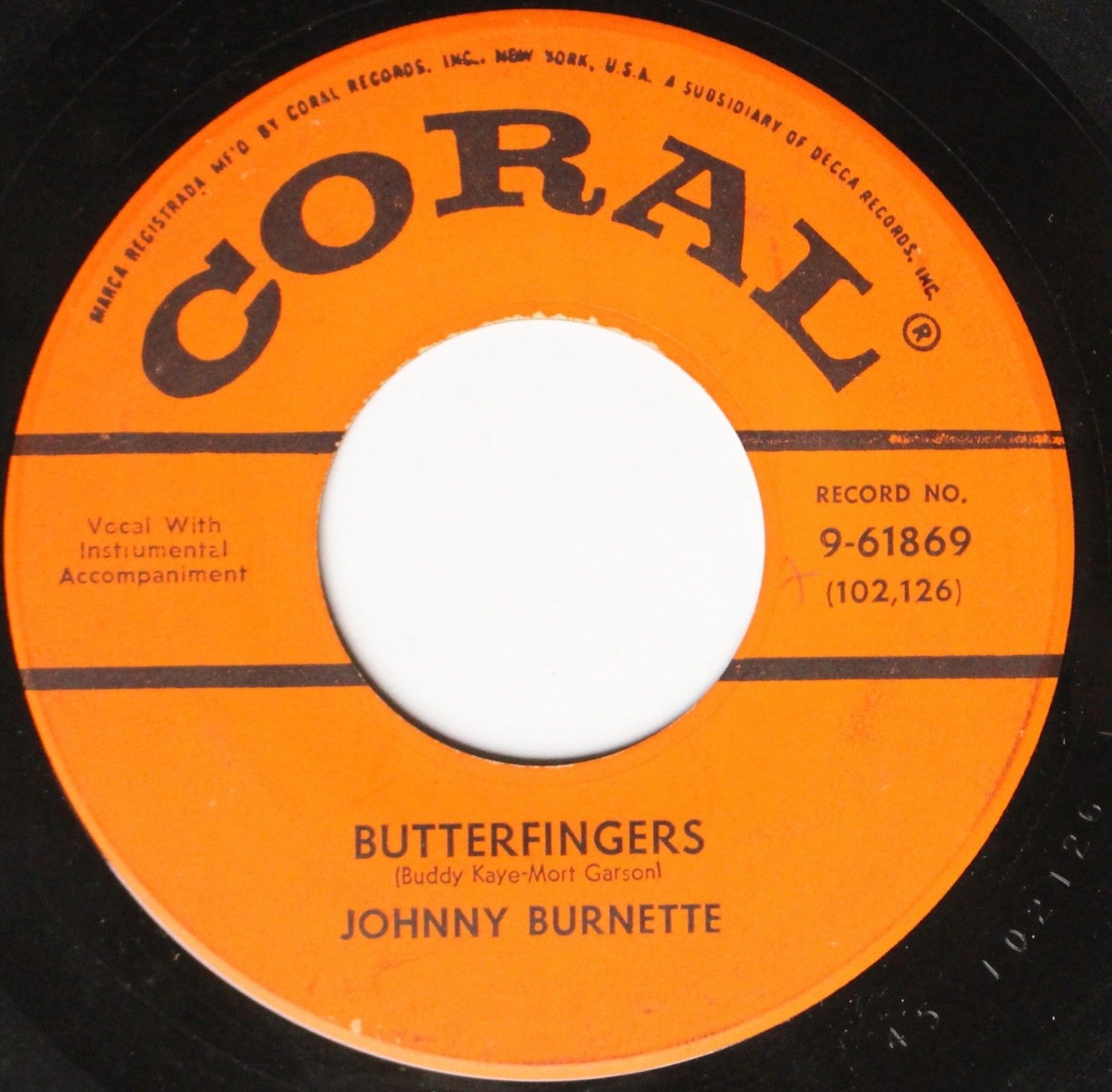 08 57....9-61869....JOHNNY BURNETTE..Butterfingers (45-102126)/Drinking Wine, Spo-Dee-O-Dee, Drinking Wine (45-100265)