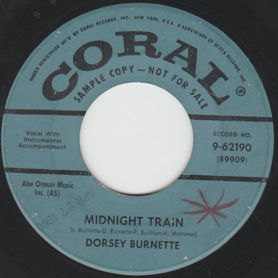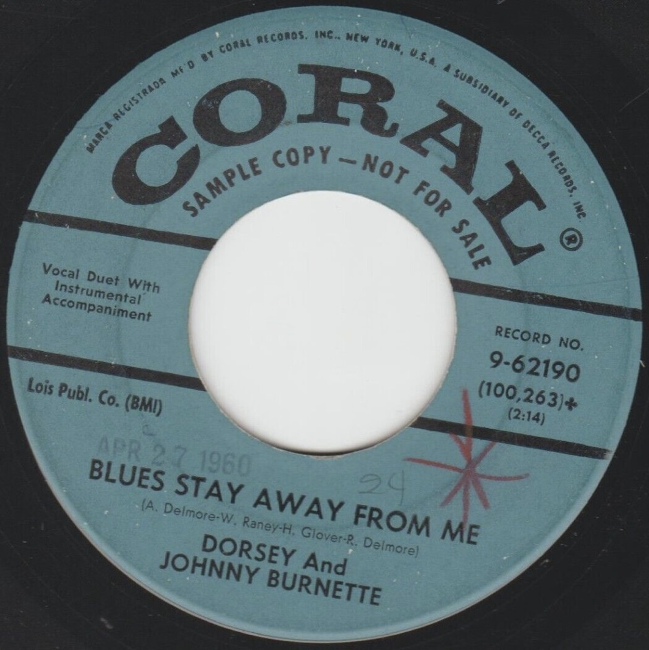 04 60....9-62190....DORSEY And JOHNNY BURNETTE..Blues Stay Away From Me (100,263)/DORSEY BURNETTE..Midnight Train (89909) (