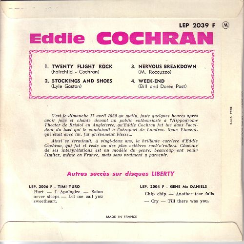 Die Franzosen sind ja bekannt für schöne EPs. Durch Zufall habe ich auch eine von Eddie Cochran in meiner Sammlung. Ich suchte Anfang der 60er-Jahre den Titel "Nervous Breakdown" und er ist mir in dieser Form angeboten worden. Die anderen drei Titel hatte ich zwar schon, aber das war mir egal. Übrigens "Twenty Flight Rock" auf dieser EP ist die Urfassung und nicht jene Aufnahme mit Chor, wie man nach den Zeitmerkmalen (1962) vermuten könnte. Es folgen noch ein paar britische Scans