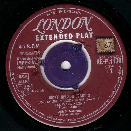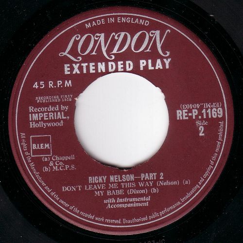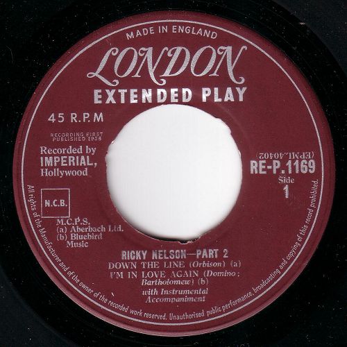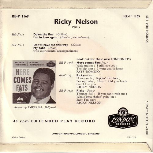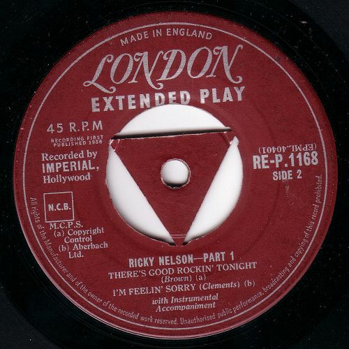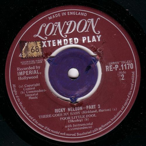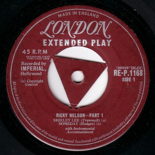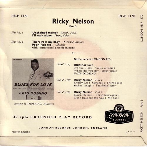 In den Fünfziger-Jahren hat von uns Jugendlichen kaum wer eine LP gekauft. Wir hatten zwar in unserer Partie einen Burschen mit reicheren Eltern, aber selbst der kaufte nur selten LPs. Um auch diese Titel an die Jugendlichen verkaufen zu können haben viele Plattenfirmen ganz einfach aus den LP-Titeln drei EPs gemacht. So konnten wir langsam aber sicher in schätzungweise drei Monaten trotz unserem geringen Gerschtl (Geld) zu den LP-Titeln kommen. Hier habe ich dafür ein gutes Beispiel weil in diesem Falle die meisten Titel der LP "Ricky Nelson" (LONDON HA-P 2119/IMPERIAL 9050) einmalige Aufnahmen waren, die es auf Single nicht gab. Ich denke an "Shirley Lee", I'm Feelin' Sorry", "There Goes My Baby" usw., also Titel die fast für uns unverzichtbar waren. TELDEC dürfte diese drei EPs aus Großbritannien eingeführt haben, weil sie unter den Nummern RE 1168, RE 1169 und RE 1170 im Katalog aufscheinen und die eigene Nummerierung RE 3xxx lautete. Die LP gab es komischerweise als TELDEC-Pressung