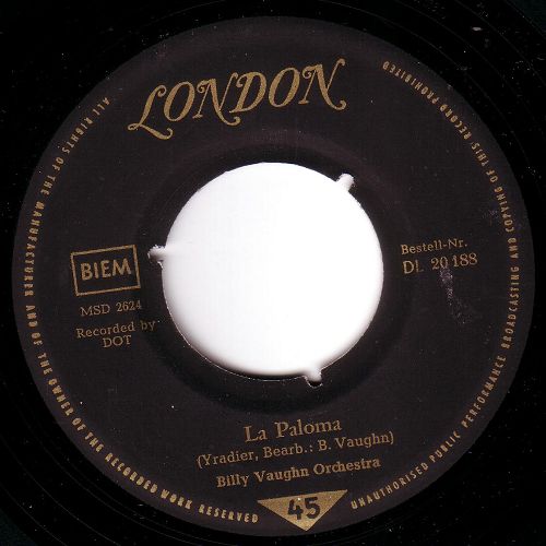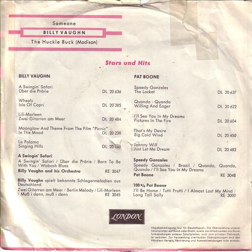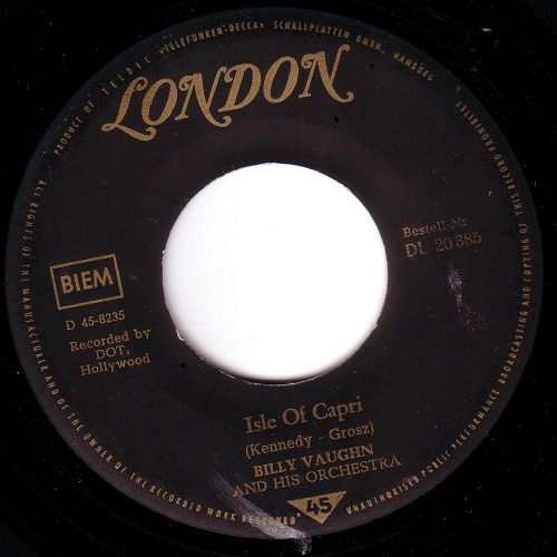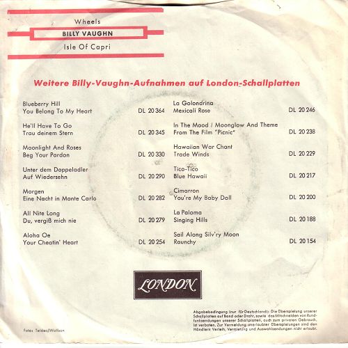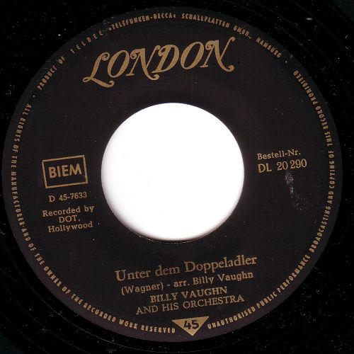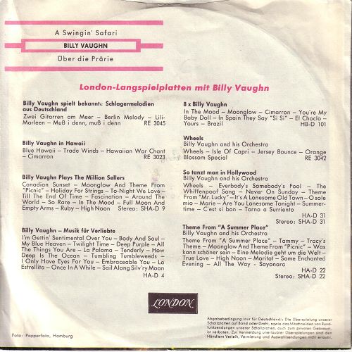 Richard Smith Vaughn wurde am 12. April 1919 in Glasgow, Kentucky, geboren und verstarb am 26. September 1991 in Escondido, Kalifornien, an Krebs. Billy Vaughn, der Pianist und Sänger, schloß sich schon früh dem Gesangstrio The Hilltoppers an. Mit ihrem ersten selbstgeschriebenen Titel "Trying" kamen sie am 22. August 1952 schon in die Charts und eroberten den siebenten Platz. Am erfolgreichsten und daher auch an bekanntesten war Billy Vaughn wohl als Orchesterleiter. Insbesondere mit seinem neuen mehrstimmigen Saxophone-Sound, mit dem er Altes, Neues, Volkstümliches und auch Rocknroll intrepretierte, wurde er weltberühmt.