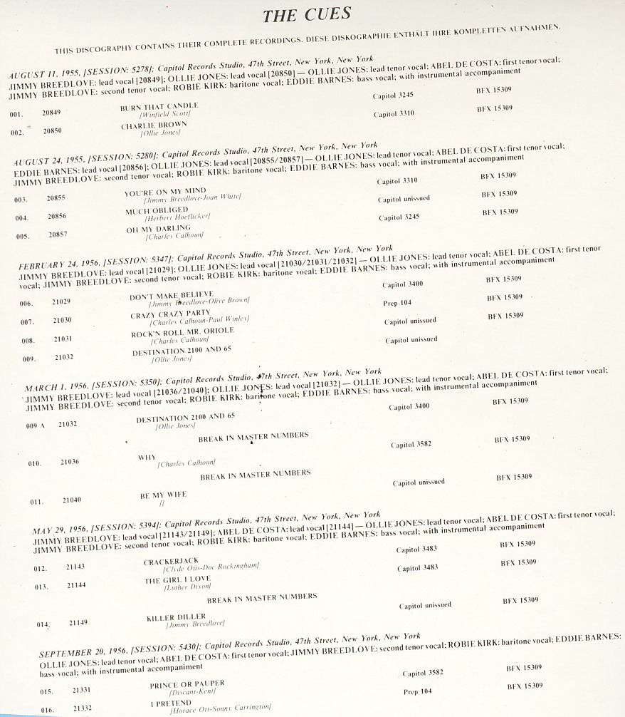 Aufgrund des Beitrages über Jimmy Breedlove wurde ich zu einem solchen für die Doo-Wap-Gruppe "The Cues" animiert. Diese Gruppe war - und ist es auch heute noch - in unseren Sammler-Kreisen insbesondere mit "Why" und "Crazy, Crazy Party" sehr beliebt.