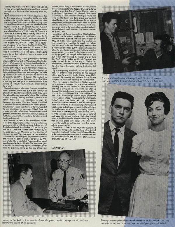 Tommy Tucker (Tommy Ray Tucker) * 1940 in Memphis/Tennessee, + 17. März 1985 an einer Rauchvergiftung, Rockabilly-Sänger als Tommy Tucker, Tommy Raye u. Tommy Ray Tucker, Karrierebeginn in night-clubs, bereits als Schüler Auftritt beim Louisiana Hayride, Vertrag bei Hi Records, Debüt-Single im März 1959 „Loving Lil“/„The Man In Love“, 1960 Club-Auftritte in Memphis, 2. Single mit „Miller’s Cave“ eine Komposition von Jack Clement (größeren Erfolg hatte Hank Snow mit diesem Titel), Wechsel zu RCA Victor, Oktober 1961 Mitglied in Eddie Bond’s Band, Probleme und Karriereknick nach einem Autounfall, 1962 Gefängnis, 1965 zwei Singles auf Challenge Records, 1966 zwei Singles auf Stan Kesler’s XL-Label, Heirat, eine Tochter, 1985 Comeback-Versuch