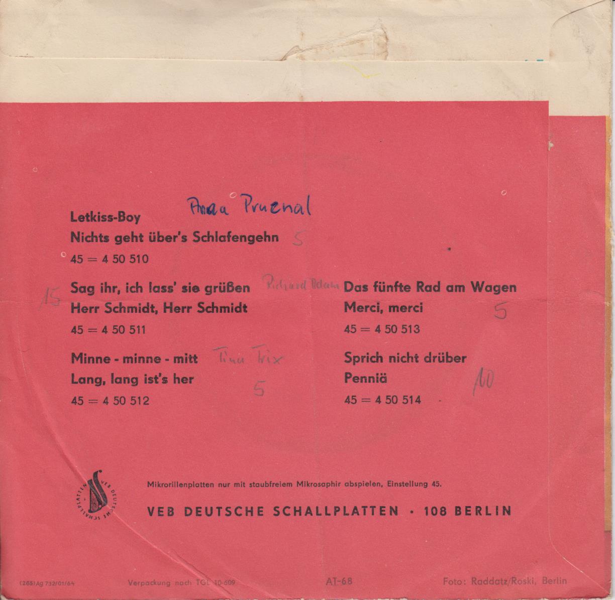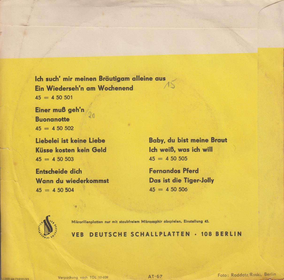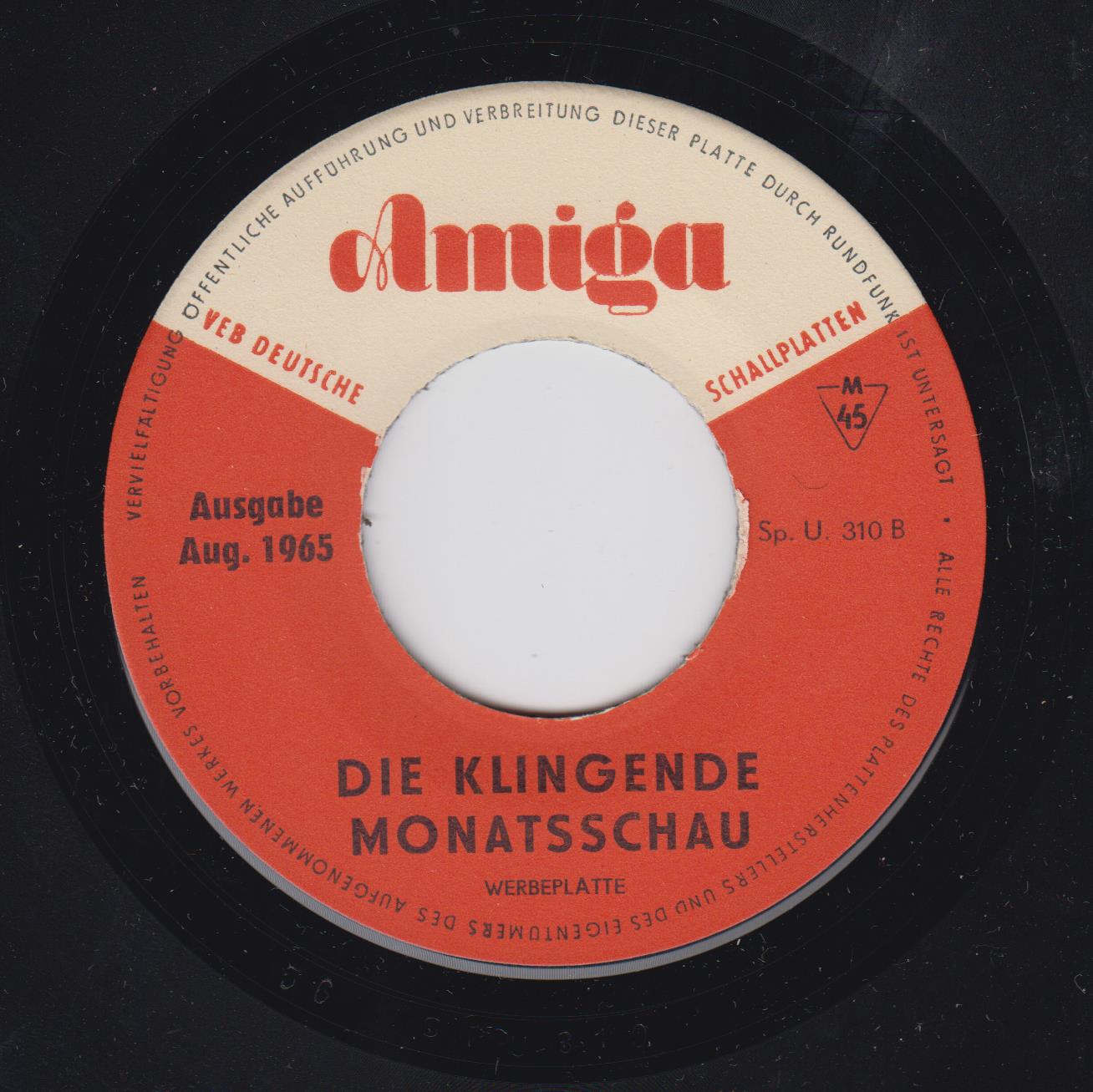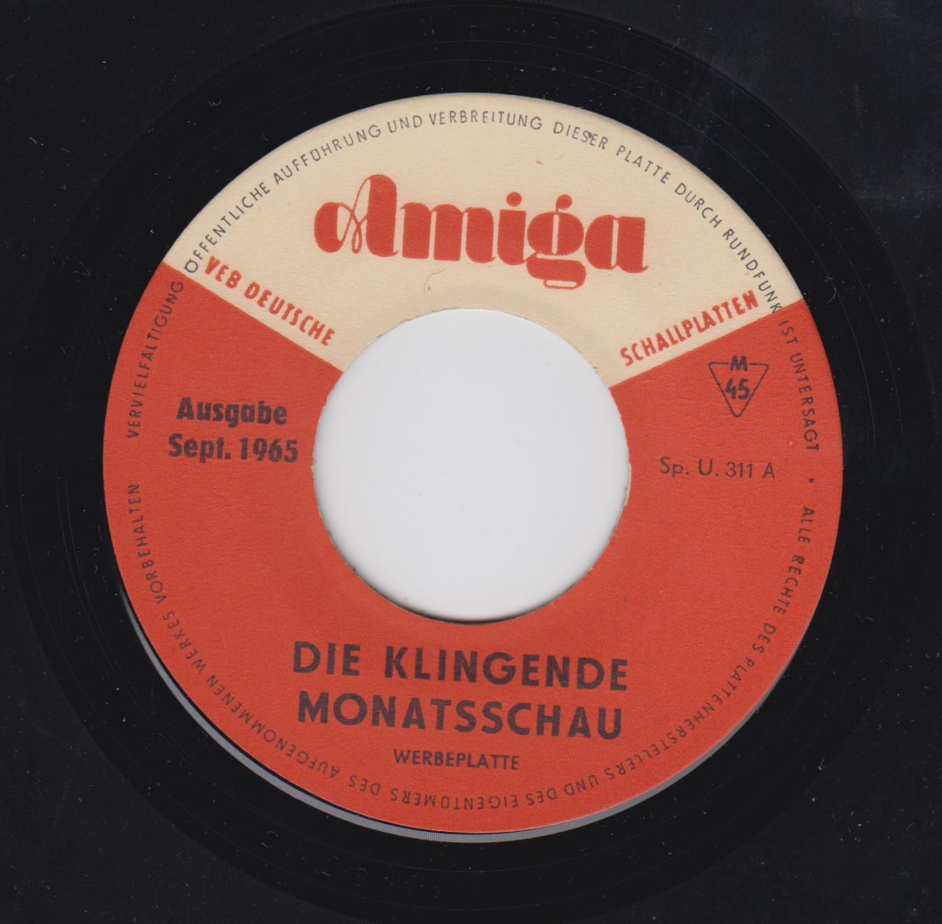 zwischen 1958 und 1967 gab es in der DDR die "Klingende Monatsschau". Das Konpept ähnelt der "Klingenden Post" (aus dem Hause Teldec): kurze Musikanspieler der Amiga-Neuveröffentlichungen werden von einem oder mehreren Sprechern angesagt. Unter dem Sammlervolk begehrt: die Ausgaben mit Manfred Krug Titeln und vorallem solche, mit Beatles-Titeln. Ein Beispiel und die Hoffnung, das die eine oder andere Ausgabe sich in euren Sammlungen befindet.