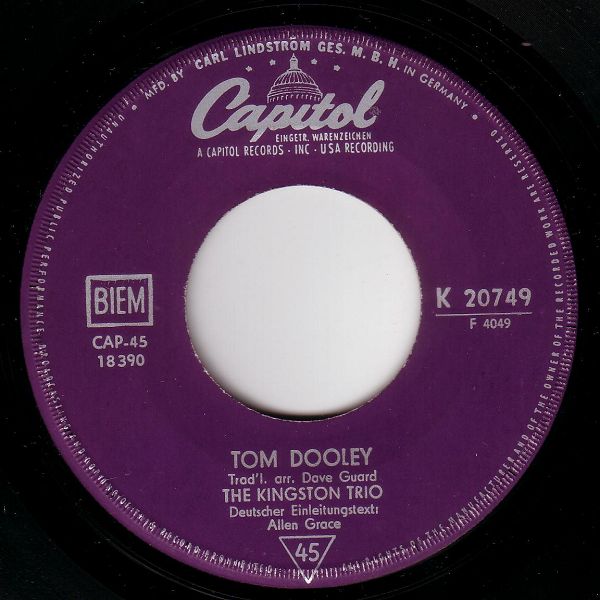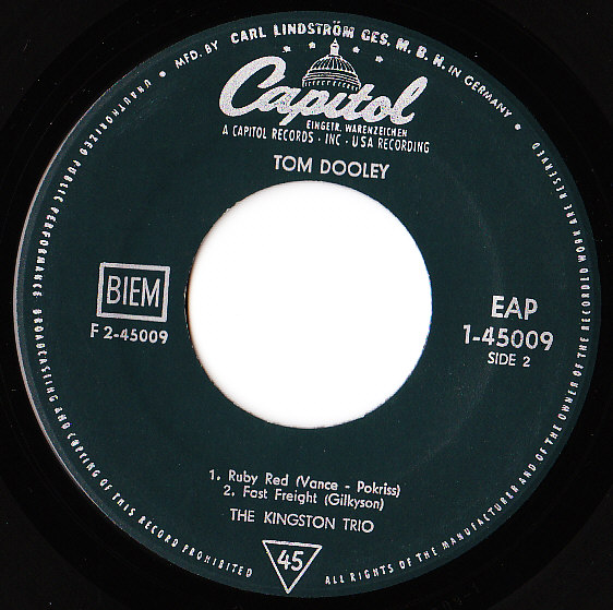 hallo forum habe hier eine sehr schöne deutsche pressung vom kingston trio capitol eap 1-45009 mit den titeln tom dooley,sloop john b,ruby red,fast freight viel vergnügen und keep rockin' albert
