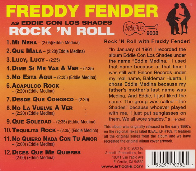 Baldemar Huerta wurde am 4. Juni 1937 in San Benito, Texas, geboren und verstarb am 14. Oktober 2006 in Corpus Christy, Texas, an Lungenkrebs. Als Kind tourte er bereits mit seinen Eltern als "Zirkus" durch die Staaten und mit fünf bekam er schon seine erste Gitarre. Mit zehn Jahren hatte er einen Auftritt im Radio. Im Jänner 1954, er war gerade sechzehn, verließ er die Schule und ging für drei Jahre zum United States Marine Corps wo er mit dem Militär-Gericht bald Probleme bekam und bereits im August 1956 unehrenhaft aus dem Militär entlassen wurde. Er kehrte nach Texas zurück und spielte in Bars, Night-Clubs und Honky-Tonks. 1957 kamen seine ersten Singles auf dem FALCON-Label aus Texas, welches auf spanische Aufnahmen spezialisiert war, auf den Markt. Unter anderem interpretierte er spanische Fassungen von Elvis-, Belafonte-, Hank Williams-Titel etc. Auf IDEAL spielte er als Eddie con los Shades ebenfalls US-Hits in spanischer Fassung ein. 1958 änderte er seinen Namen nach seiner Gitarre auf Freddie Fender und als solcher wurde er auch vielen Rockabilly-Sammlern bekannt.