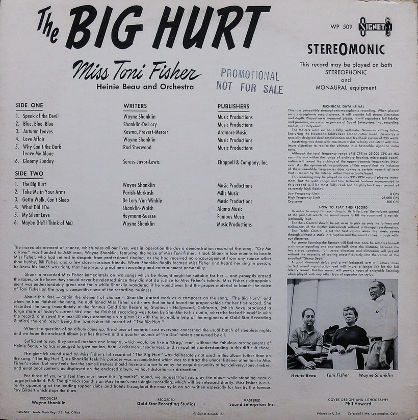 In 1959 Wayne Shanklin started his own label, Signet Records, in Hollywood. He had written a song called "The Big Hurt" that he thought would be a perfect musical vehicle for his wife, who had been on the nightclub scene in Los Angeles as a vocalist for some five years. Shanklin produced the record at Gold Star Studios in Hollywood, with Larry Levine as the engineer. Levine claims that he accidentally invented a new technique during this session that has been described as "phasing", "flange phasing", "electronic phasing" and "flanging" **. Shanklin complained that Fisher's vocal was too low in the mix. As it was too late to change the levels - it was cut in mono - Levine made two identical tapes of the mono master and transferred them simultaneously onto a third recorder while fiddling with the frequencies in a bid to lift the vocal. Because the two tracks were not perfectly synched, an accidental phasing effect was created, which gave the song a swirling, eerie sound (described elsewhere on the web as "the wind blowing through an aluminium Christmas tree").