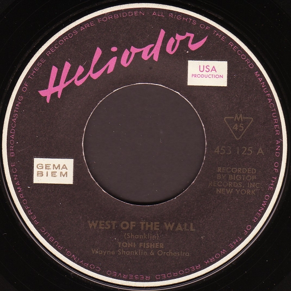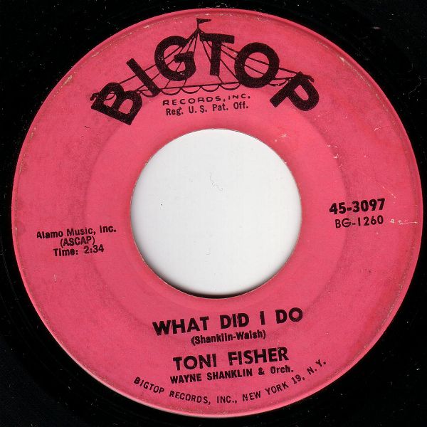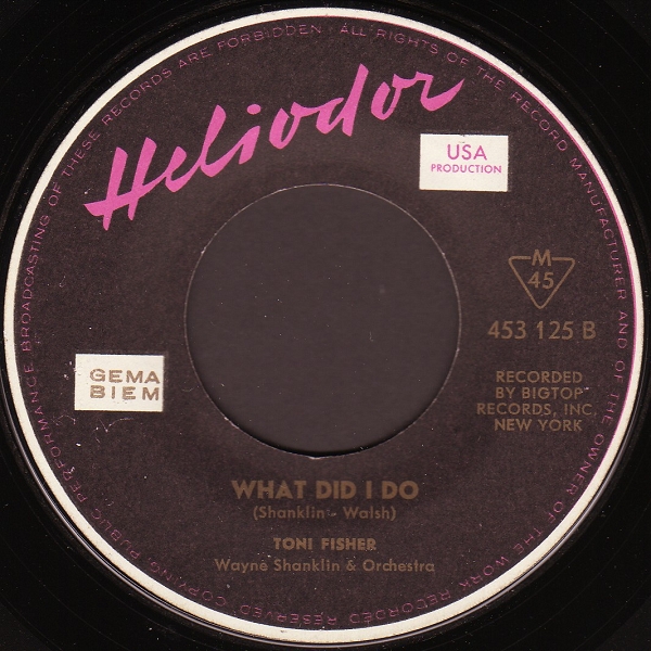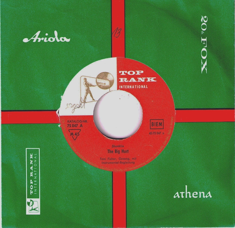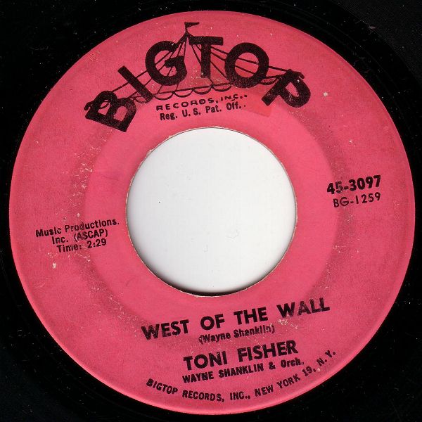 Shanklin released a Signet LP by his wife (naturally called "The Big Hurt") towards the end of 1960, but it didn't do much. After a short stay at Columbia, Toni signed with Big Top Records in New York. Her first record for this label was "West Of the Wall" (written by Wayne Shanklin), inspired by the Berlin wall, built in August 1961. It has been hailed as an expression of hope and ode to love and freedom at a time when the Cold War was at its most grim. "West Of the Wall" peaked at # 37 in the spring of 1962. It was Toni's second release in the UK (London HLX 9564), but did not chart there. A second Big Top single, "Music From the House Next Door", went nowhere, as did four subsequent releases on Smash. In 1964 she was resigned to Signet for three further singles. Her last recordings were made for Capitol in 1967. She spent the rest of the sixties doing club dates and retired from the music scene after the death of her husband in 1970. Toni Fisher died of a heart attack in 1999 at the age of 67.