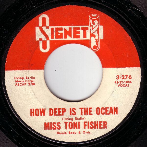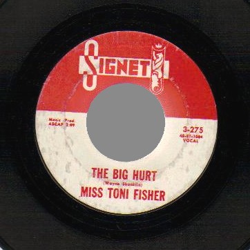 "The Big Hurt" went all the way to # 3 on the Billboard pop charts (also # 16 R&B) in the last week of 1959. This gave Toni the chance to appear on the shows of Dick Clark and Ed Sullivan. In the UK, the record was released on Top Rank JAR 261 and was # 30 for one week in February 1960. There were British cover versions by Maureen Evans on Oriole and Joan Small on Parlophone. Later, "The Big Hurt" would be recorded by Del Shannon (1966, # 94 in Billboard), Wes Montgomery (1966), Sandy Posey (1967), Scott Walker (1967), The Lettermen (1971), Timi Yuro (197?), Nick Cave (1997) and Frank Black and the Catholics (1998). The follow-up, a remake of Irving Berlin's "How Deep Is the Ocean", was not nearly as successful, peaking at # 93. A third Signet single followed later in 1960, "Everlasting Love", written by Wayne Shanklin and Allan Sherman (yes, the same guy who later recorded "Hello Mudduh, Hello Fadduh"). This is not the same song as the Robert Knight / Love Affair / Carl Carlton / Narvel Felts / Gloria Estefan hit, nor as the Barbara Pittman song, nor as the 1978 Andy Gibb hit.