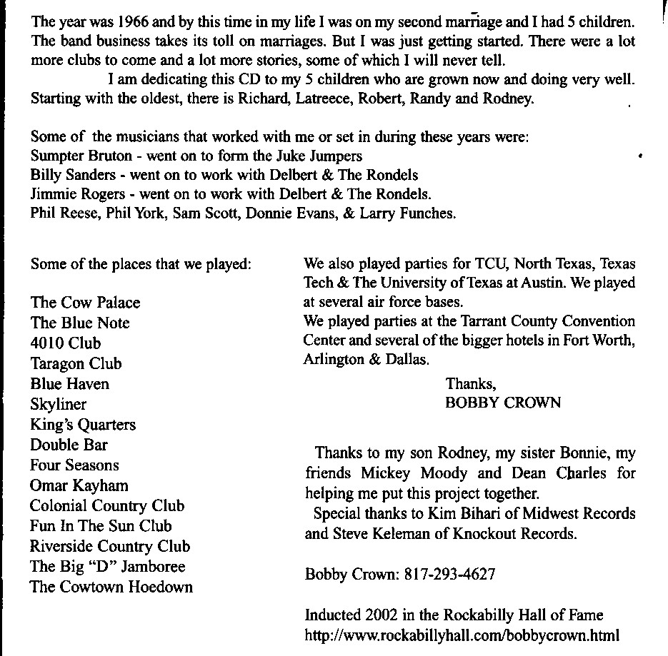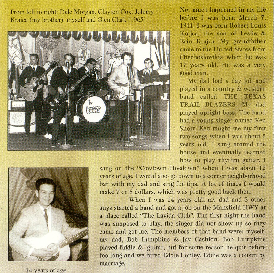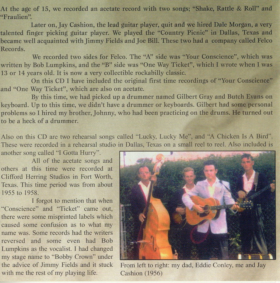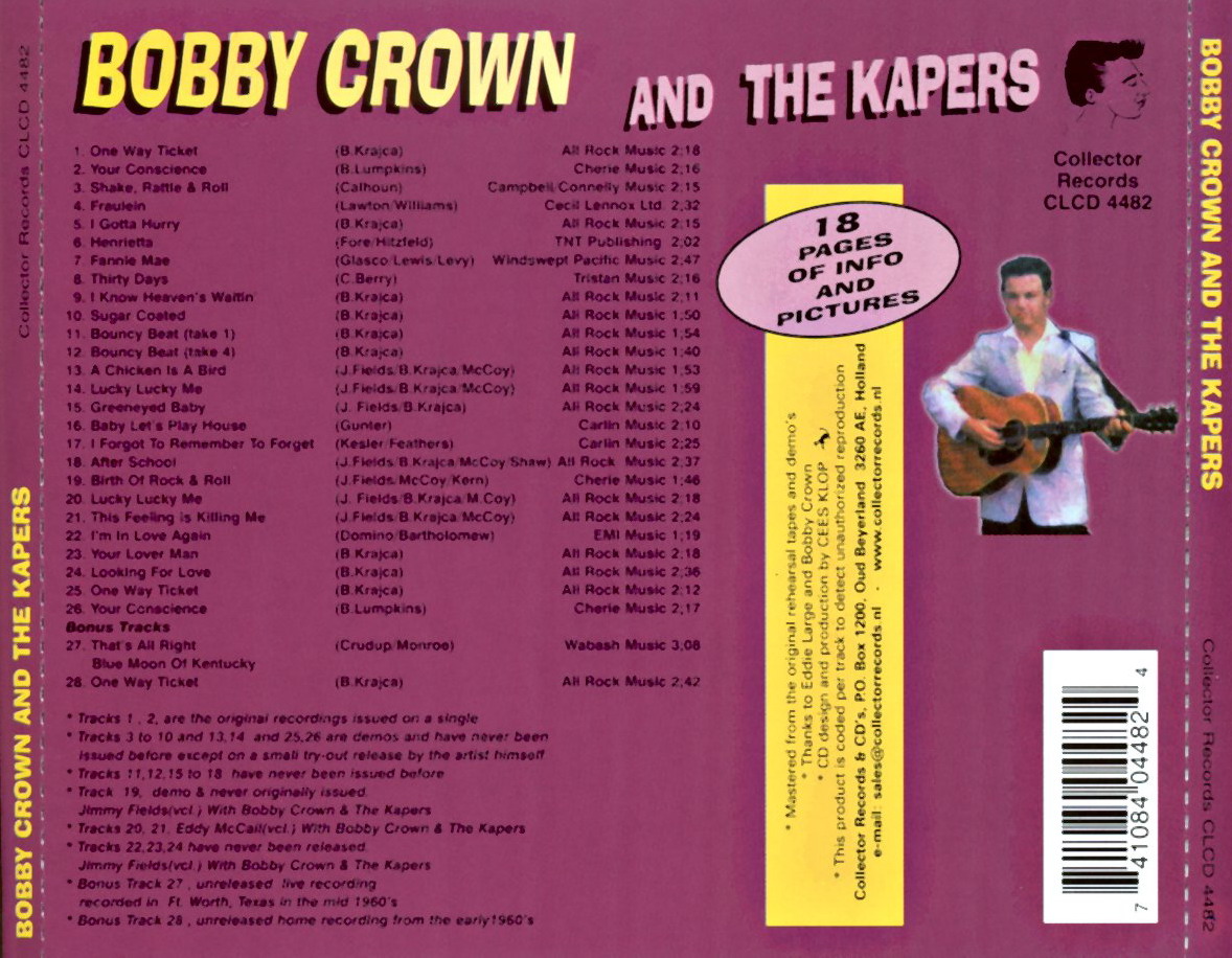 Der Rocknroll-Sänger und Gitarrist Bobby Krajca wurde am 7. März 1941 in Fort Worth, Texas, geboren. Schon als 12-jähriger spielte er in der Band seines Vaters. Eine amüsante Geschichte gibt es über seine erste Single-Veröffentlichung. Da der Autor des A-Seiten-Titels auch Bobby mit Vornamen hieß, hat man irrtümlich seinen Namen, Bobby Lumpkin, anstatt Bobby Crown, der Bühnenname von Bobby Krajca, als Interpret auf das Label gedruckt. Bobby war speziell in den frühen Sechzigerjahren sehr viel im Studio. Veröffentlicht wurden diese Aufnahmen jedoch erst weit später und meist auf CD. Hier nun seine 45 RPM-Single-Veröffentlichungen bis 1966: