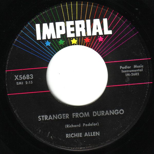 Not content to be just a sideman, Richie released ten instrumental singles and three albums on Imperial in the early 1960s under the nom de plume "Richie Allen" (and one vocal single as "Dickie Allen"). The first of these singles, "Stranger From Durango" (Imperial 5683), went to # 90 on the Billboard charts. When surf music became popular, Richie started to concentrate on that genre. The LP's that came out under the name "Richie Allen and the Pacific Surfers" featured L.A.'s top session men : Rene Hall, Tommy Tedesco, Plas and Ray Johnson, Lincoln Mayorga, Ray Pohlman and Sandy Nelson among them. Two of these Imperial albums, "The Rising Surf" and "Surfer's Slide" were reissued on CD by Sundazed in 2006.