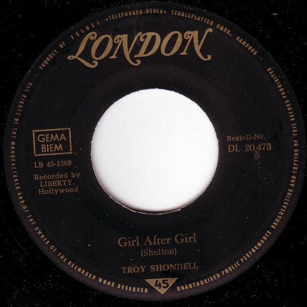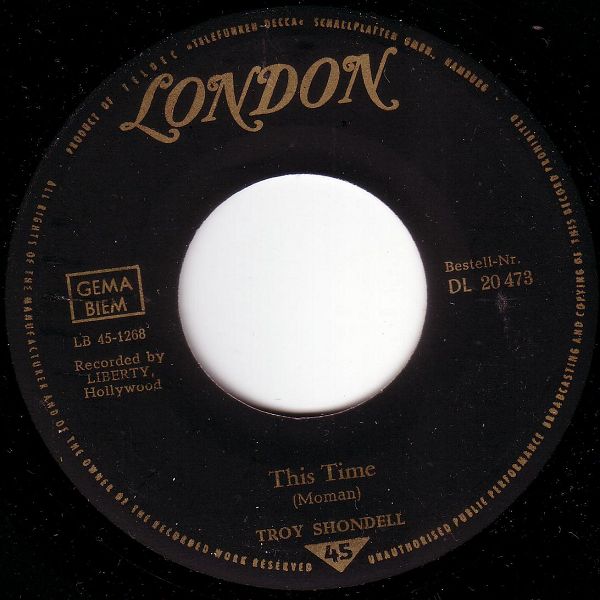 hier die Labelscans der deutschen London Single DL 20 473 von Troy Shondell: This Time / Girl after Girl.