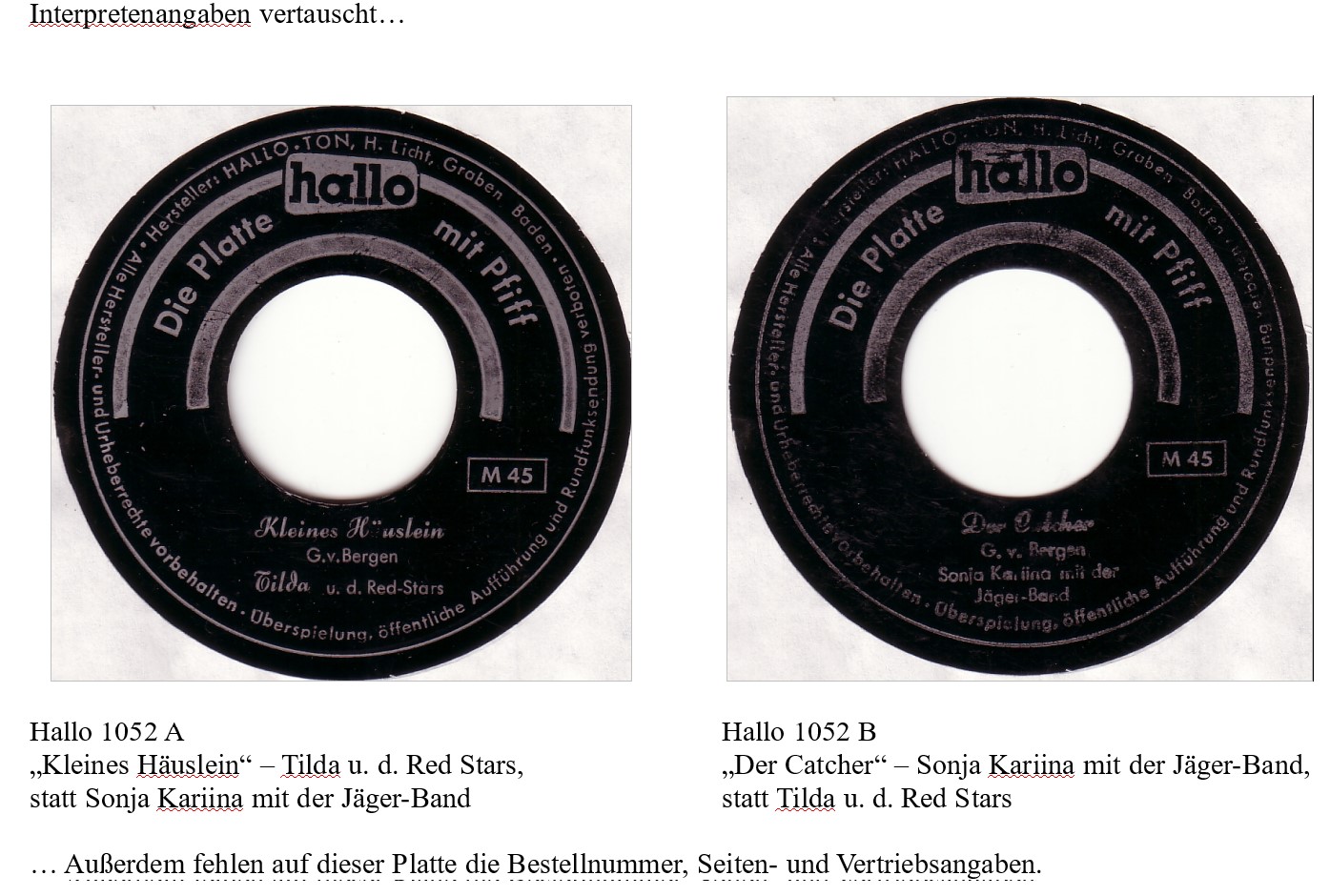 Auf der Hallo 1052 mit den Titeln „Der Catcher“ / „Ein Häuschen Klein am Waldesrand“ wurden (nicht nur) die Interpretenangaben vertauscht…