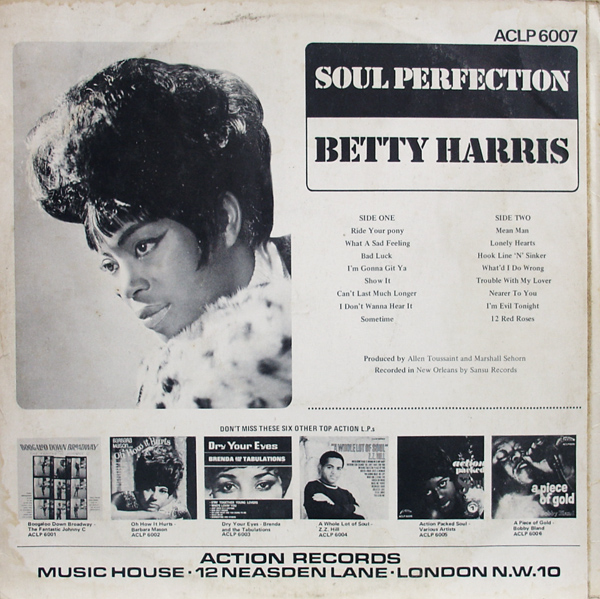 "Love Lots of Lovin'," a duet with fellow Toussaint charge Lee Dorsey, closed out the year — Harris planned to support the record on tour with Otis Redding, but on December 10, the soul giant lost his life in a plane crash. Harris forged on, with 1968's "Mean Man" delivering her grittiest effort to date; backed by a session group that would soon evolve into the Meters, she then ended her Sansu tenure with the fierce "Trouble with My Lover," reuniting with Toussaint for one final collaboration, the 1969 funk cult classic "There's a Break in the Road" (licensed to the SSS International label).