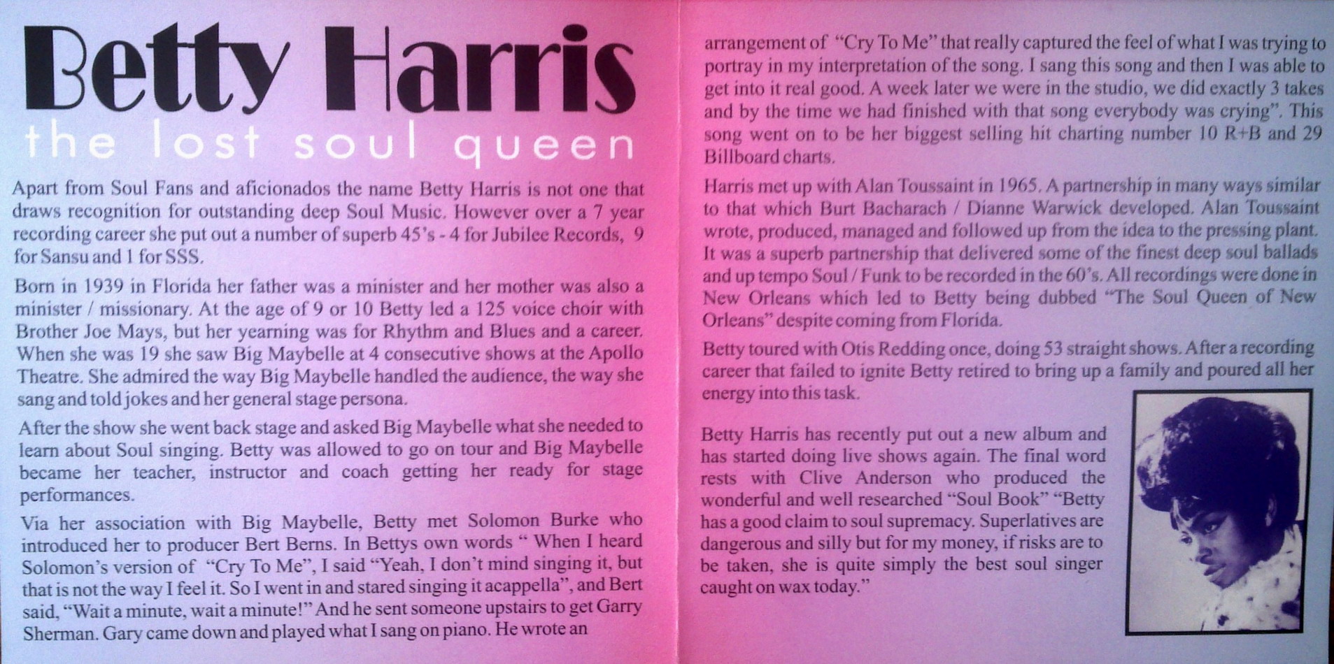 Renowned in deep soul circles for the devastating ballad "Cry to Me," singer Betty Harris was born in Orlando, FL, in 1941 and raised primarily in Alabama. The child of preachers, her deep church roots conflicted with her desire to sing secular soul music, and at 17 she left home to pursue a performing career, briefly apprenticing under R&B star Big Maybelle before eventually landing in California, cutting the 1960 single "Taking Care of Business" for the Douglas label. Record promoter Babe Chivian recommended that Harris relocate to New York City, promising her an audition with Brill Building producer and songwriter Bert Berns — there she performed a slow, gospel-inspired rendition of "Cry to Me," an uptempo Berns-produced hit for Chivian's client Solomon Burke.