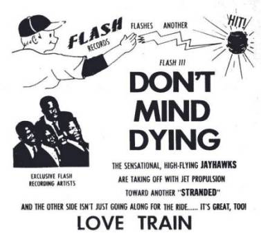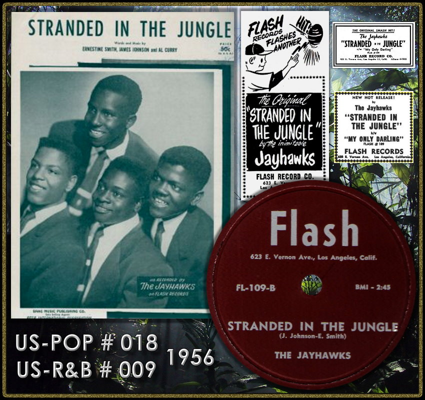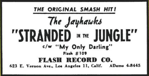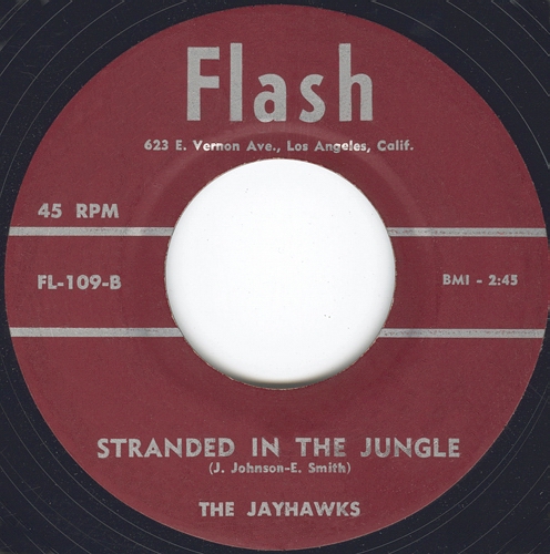 über The Jawhawks habe ich im Forum nichts entdeckt. Die Rhythm & Blues Formation startete 1955 mit drei Platten auf dem kleinem Flash-Label. Ihre zweite Single "Stranded in the Jungle" wurde von den CADETS erfolgreich gecovert. Die Gruppe wechselte häufig den Bandnamen (u.a. The Vibrations).