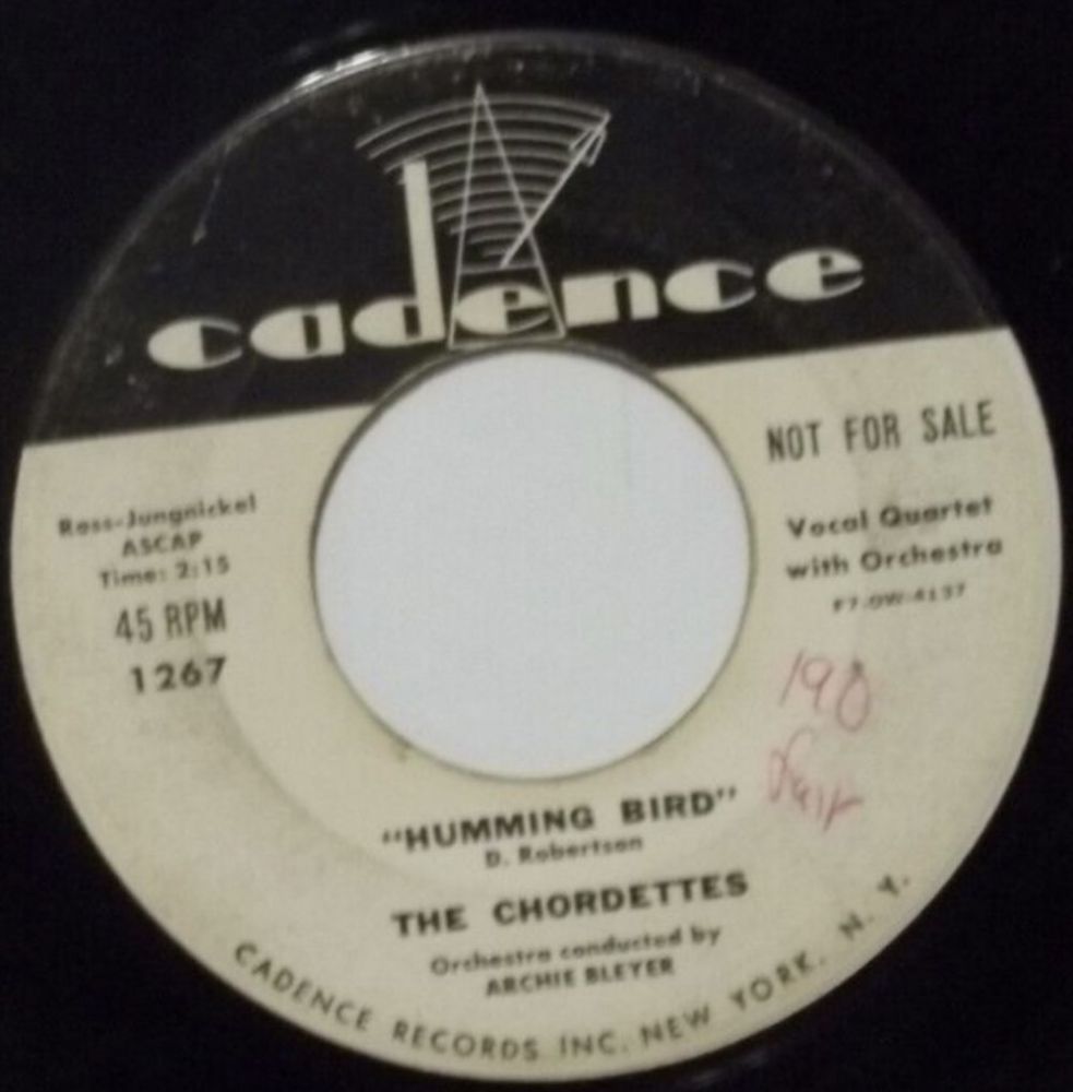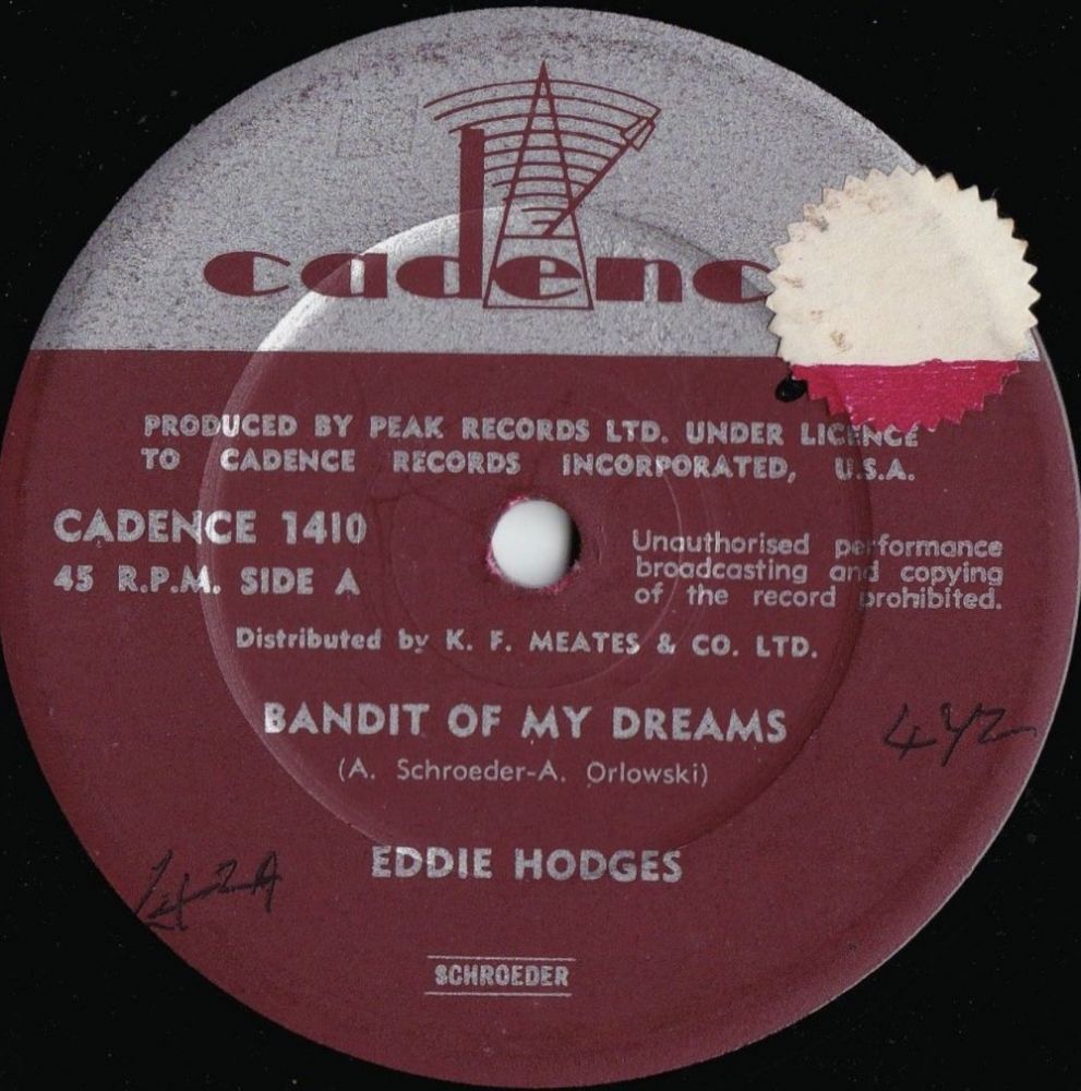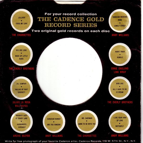 Das CADENCE-Label mit Sitz in New York City wurde 1952 vom Orchesterleiter Archie Bleyer gegründet. Die Plattenherstellung erfolgte sowohl durch RCA als auch durch COLUMBIA, darum gibt es bei den Labels feine Unterschiede, obwohl das Grund-Logo immer das Gleiche ist.