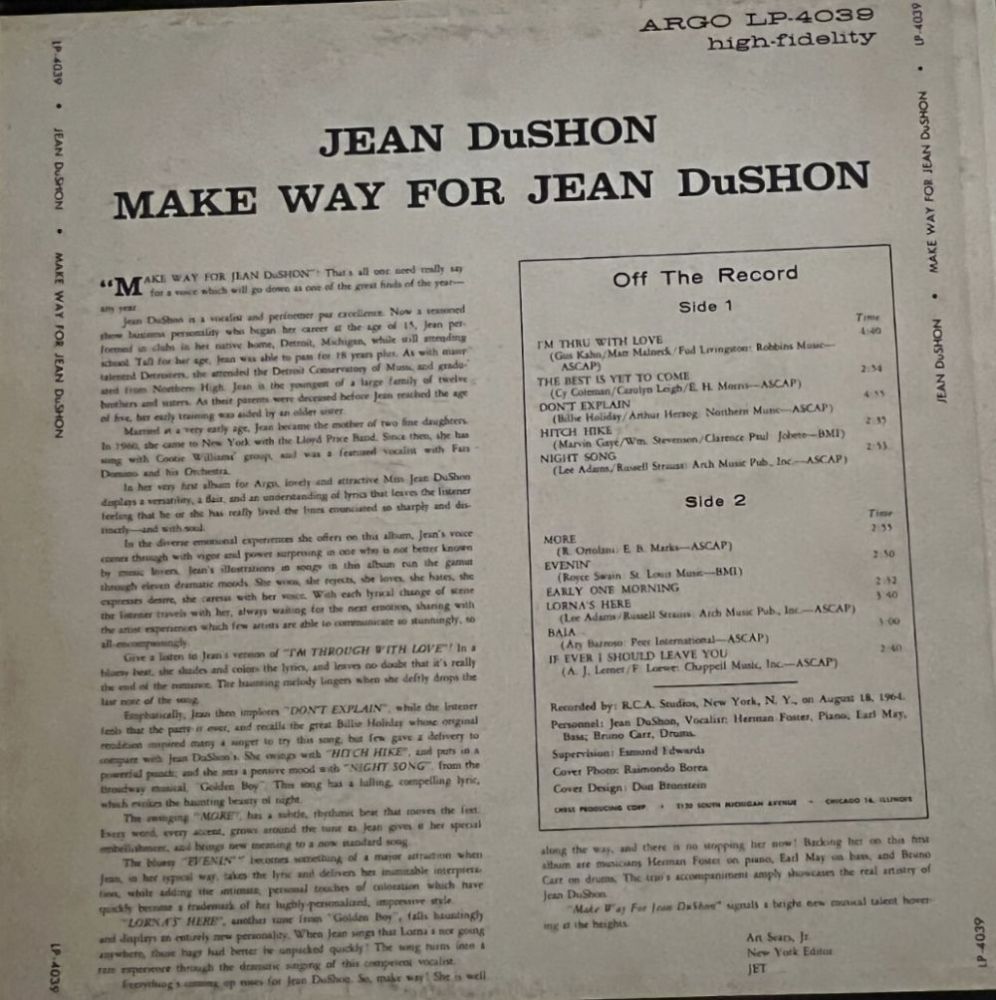 Detroit native, Jean DuShon (born Anna Jean Harris) was the very first artist to record the legendary Ron Miller/Orlando Murden classic, “For Once in My Life”. Others have claimed to be the first, but it was DuShon who was invited to Miller's home to interpret the tune. DuShon started singing gospel as a child in a Baptist church and later won numerous talent contests which inspired her to go professional at 15. Like countless young singers, DuShon was fascinated by the artistry of blues queen Dinah Washington, whose “home away from home” was Detroit. Washington confronted DuShon one night backstage at the Flame, prompting the young girl to develop her own style. Years later, DuShon sensed someone in the audience at Birdland staring at her intensely and her gaze zeroed in on an evil-eyed “blond” woman, who turned out to be the Queen of the Blues herself, Dinah Washington! After studying voice at the Detroit Conservatory, DuShon caught the attention of famous agent, John Levy, who was managing he likes of Joe Williams, Dakota Staton, Cannonball Adderley, Sarah Vaughan, Ramsey Lewis, Wes Montgomery, George Shearing and his new star, the dynamic Nancy Wilson. He secured many class engagements across the nation for DuShon and her national fame grew. One of the premiere jazz and blues singers ever, DuShon also starred on Broadway. For a brief period, DuShon sang with Lloyd Price's Band and the legendary Fats Domino invited her to tour the nation with him. They played the best places, culminating in Las Vegas at the lavish Flamingo Hotel. Back in New York at Birdland, DuShon also shared marquees with jazz greats Miles Davis and Sonny Stitt. During this period, she wowed audiences at the Blue Note and Basin Street East. While she was with ABC-Paramount, she appeared at the Village Gate with Ray Charles and was the sole female vocalist at the 1967 New Jersey Jazz Festival with Count Basie, Joe Williams and Ramsey Lewis. Her nightclub schedule was grueling as she worked in all types of venues with a plethora of performers including Etta James, Motown's Marvin Gaye, and Smokey Robinson. In southern states she shared bills with T-Bone Walker, Screamin' Jay Hawkins. At New York's Apollo Theatre, she graced the stage with Big Mama Thornton, Big Maybelle. She was called to Chicago to replace Odetta in the musical "Little Dreamer: A Nite in the Life of Bessie Smith". DuShon made time for several TV appearances, most notably "PBS's Soul!" (with B. B. King), The Merv Griffin Show. DuShon then received a call in Paris, France from the producers of "Blues in the Night", which was set to open in New York in four weeks. Famed R&B legend, Ruth Brown had become ill and was unable to continue. DuShon flew to New York and went into rehearsals with Leslie Uggams and Debbie Shapiro. Her scorching rendition of Bessie Smith's heart-breaking “Wasted Life Blues” had the same impact as Jennifer Holliday's “And I Am Telling You I'm Not Going”. During a European stint, she sang for Princess Grace of Monaco and was invited to perform for King Hussein of Jordan. Returning home in 1992, she performed at one of Bill Clinton's inaugural galas with Little Jimmy Scott and B. B. King. Still performing, DuShon is ready to record again!