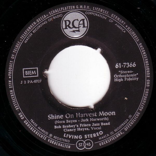 06 59....61-7366....Bob Scobey's Frisco Jazz Band Clancy Hayes, Vocal..Put On Your Old Grey Bonnet/Shine On Harvest Moon (RCA VICTOR 7366)
