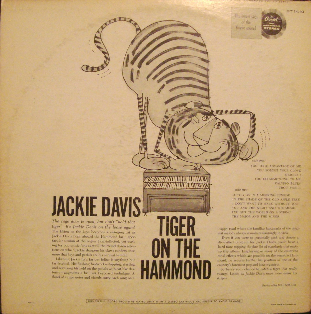 Jackie Davis (Jackson J. Davis) wurde am 13. Dezember 1920 in Jacksonville, Florida, geboren und verstarb am 15. November 1999 ebenda. Jackie Davis war der erste Musiker der die Orgel für den Jazz populär machte, noch lange bevor Jimmy Smith quasi das Synonym für "Organ Jazz" wurde. Davis meinte einmal, dass ihn die Musik vererbt wurde. Seine Mutter spielte "Washtub", ein billiger Ersatz für den Bass und er nütze als Kind jede frei Minute, um auf Großmutter's Klavier spielen zu können. Mit acht Jahren war er bereits Mitglied bei einer lokalen Tanz-Band. Als er elf wurde konnte er sich mit der gesparten Gage bereits ein eigenes Klavier kaufen. 1943 erwarb er das Musik-Diplom am Florida A & M College. Nach Ableistung des Kriegsdienstes arbeitet er weiter als Pianist und begleitete Interpreten wie Sarah Vaughan, Dinah Washington oder Billie Daniels. Die Orgel zog ihn schon sehr früh an und neben seiner Tätigkeit als Pianist versuchte er bereits die Orgel "jazzfähig" zu machen. Bei RCA Victor wurden die ersten seiner Aufnahmen veröffentlicht die Firma meinte aber, für ein Album wären diese Aufnahmen nicht geeignet. Erst bei TREND kam sein erstes Album heraus, welches später auch von KAPP übernommen wurde.