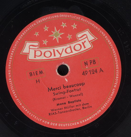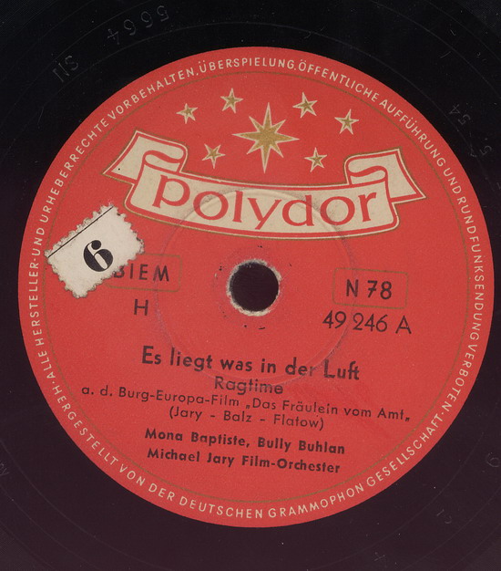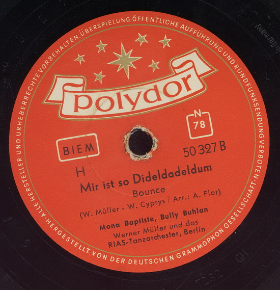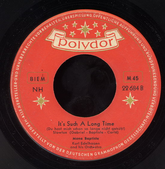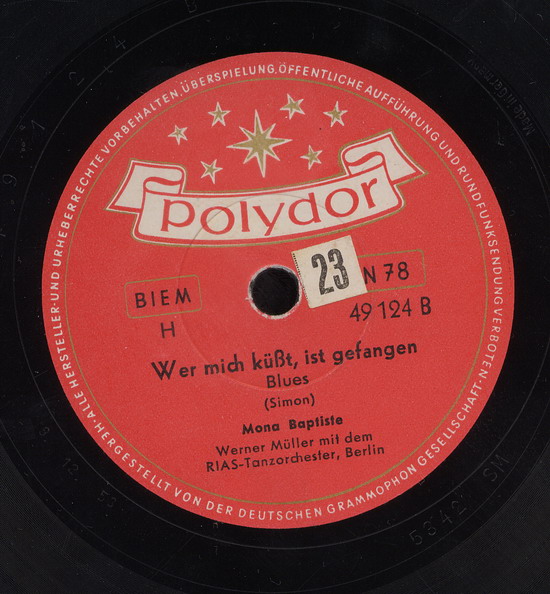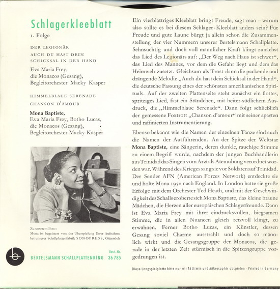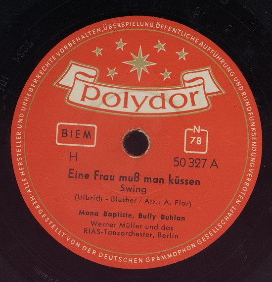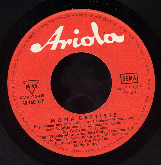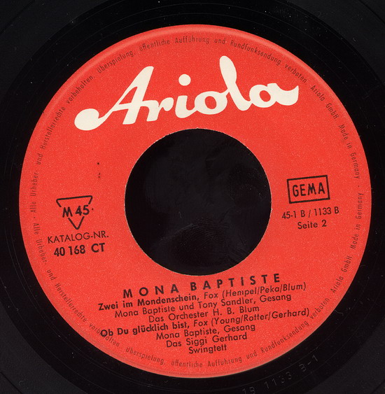1953 erhielt die Sängerin ihren ersten Plattenvertrag in Deutschland und bereits ein Jahr später war sie in den Musikfilmen "An jedem Finger zehn" und "Tanz in der Sonne" zu sehen und zu hören; 1955 folgten die Filme "Stern von Rio", "Wie werde ich Filmstar?" und "Symphonie in Gold". Mona Baptiste war jedoch mit dem, was man ihr an Rollen und Liedmaterial angeboten wurde, nicht glücklich und konzentrierte sich daher wieder vermehrt auf ihre Karriere als Sängerin. Mitte der 50er Jahre war sie in Deutschland ein vielbeschäftigter und beliebter Unterhaltungsstar und feierte als Solistin, vor allem aber als Partnerin von Bully Buhlan, ihre größten Erfolge; der Titel "Es liegt was in der Luft" wurde 1954 zu einem der beliebtesten Lieder des Gesangs-Duos.