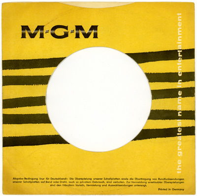 ich habe einige deutsche MGM-Pressungen (wobei ich eigentlich nur die Electrola-Ausgaben bis September 1959 sammle...). Dabei ist mir aufgefallen, dass in meiner Sammlung Singles der Electrola-Ära wie auch aus dem Deutsche Grammophon-Vertrieb im bekannten gelben MGM-Firmenlochcover stecken.