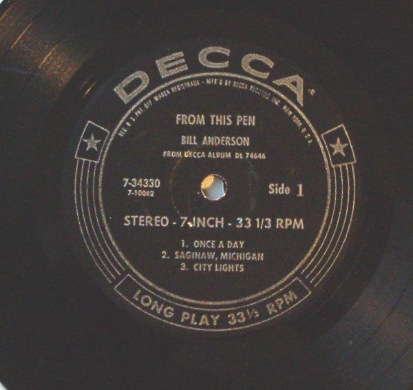 Bereits während seines Studiums hatte er als Diskjockey Eingang in die Szene gefunden. Bei einem kleinen Label spielte er den selbst verfassten Song City Lights ein. Es wurden insgesamt 500 Singles gepresst, die er eigenhändig verkaufte oder verschenkte. 1958 hörte Ray Price diesen Song zufällig im Radio. Er nahm ihn selbst auf und hatte damit einen seiner größten Hits. Bill Anderson erhielt nach diesem Erfolg einen Schallplattenvertrag vom Decca-Label, das ihn vor allem als Songwriter gewinnen wollte.