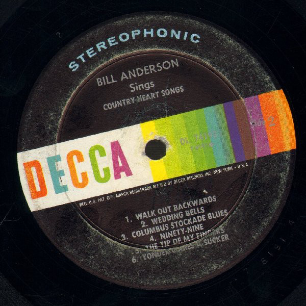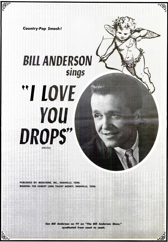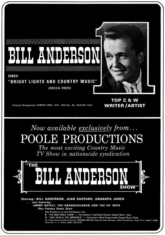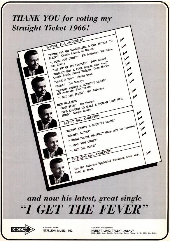 Auch andere waren mit seinen Songs erfolgreich. Sein Schützling Connie Smith erreichte mit Once A Day ihren ersten Top-Hit. Unter anderem erzielten Lefty Frizzell, Hank Locklin, Porter Wagoner, Mickey Gilley und Roger Miller hohe Chart-Platzierungen. Bill Anderson gehörte zu einer neuen Generation von Country-Musikern mit städtischem Hintergrund und College-Abschluss, die die alte Garde einfacher Jungs vom Lande allmächlich verdrängte. Weitere Hits waren: Five Little Finger (1964), Bright Lights And Country Music (1965), I Get The Fever (Platz Eins 1965), My Life (Throw It Away If I Want To (Platz Eins 1969).
