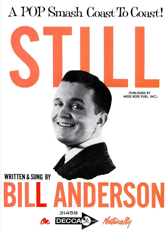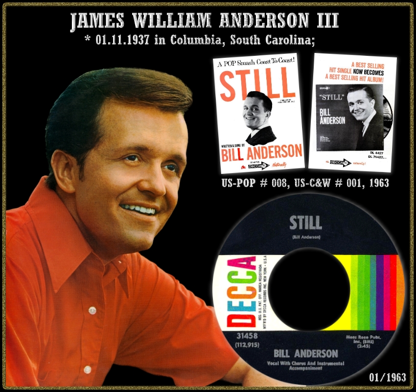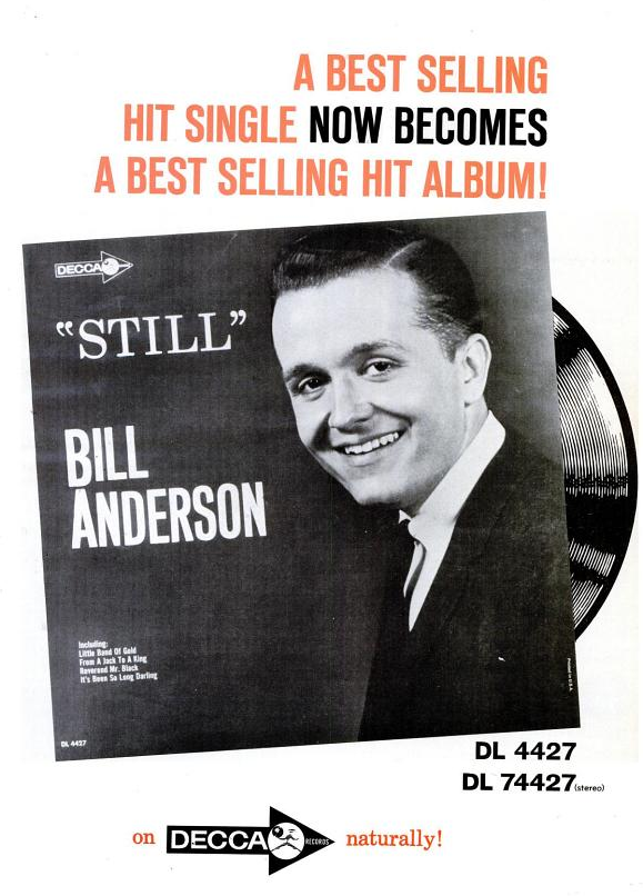Anfang der 1960er Jahre hatte er, angefangen mit Tips Of My Fingers, mehrere Top-10-Hits. Auch als Songwriter war er erfolgreich. Jim Reeves hatte mit seinem I Missed Me einen Hit. 1961 trat Anderson erstmals in der Grand Ole Opry auf. Ein Jahr später gelang ihm mit Mama Sang A Song sein erster Nummer-1-Hit. Seinen endgültigen Durchbruch hatte er 1963 mit der einfühlsamen Ballade Still, der sogar den Crossover in die Pop-Charts schaffte und als sein bekanntester Song gilt. Seine Anhängerschaft bestand vorwiegend aus weiblichen Fans. In diesen Jahren erhielt er den Spitznamen „Wispering Bill“ (dt. „Flüsternder Bill“), der - allerdings übertrieben - auf seine leise Stimme und sein langsames Gesangstempo anspielte.