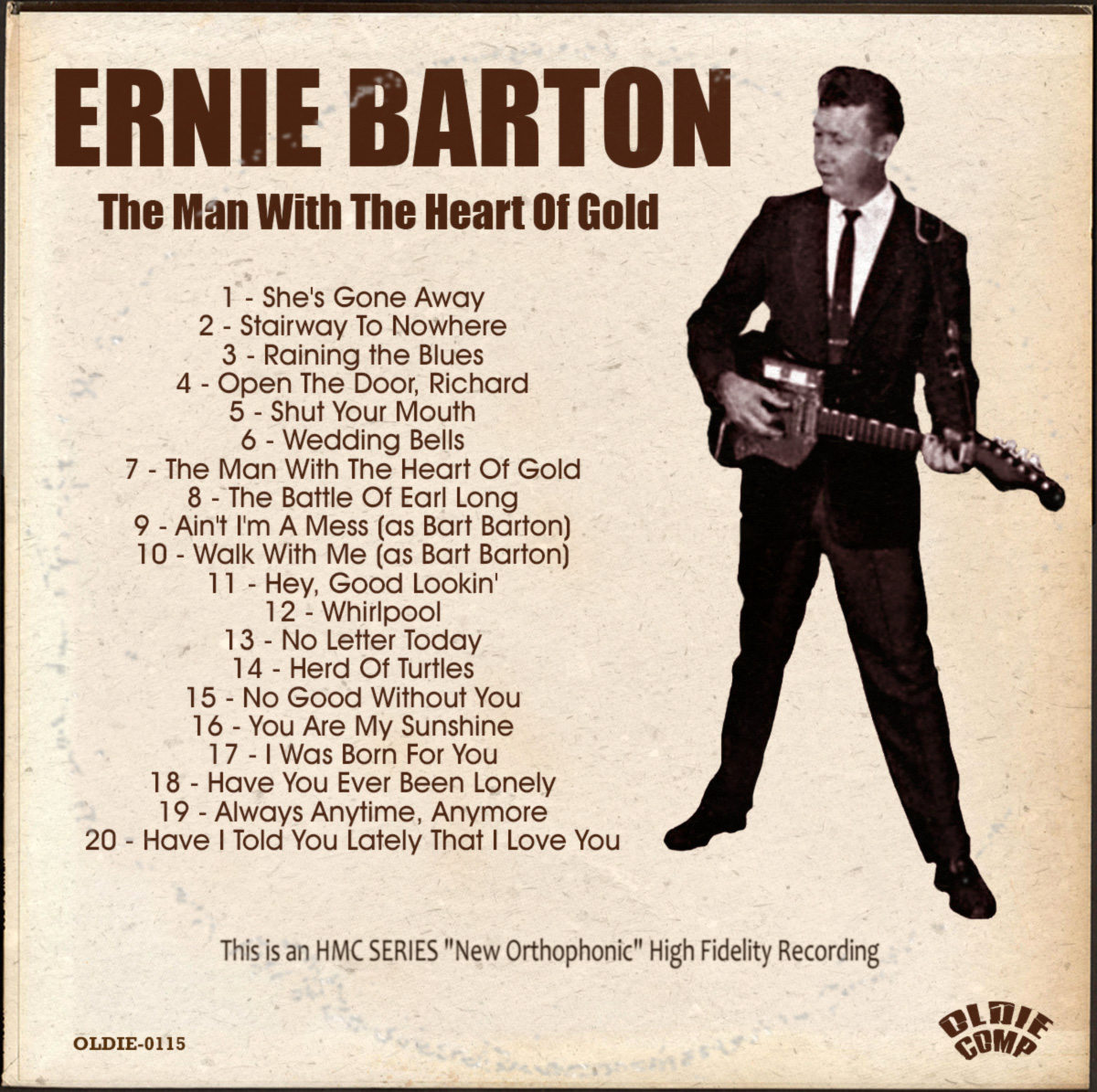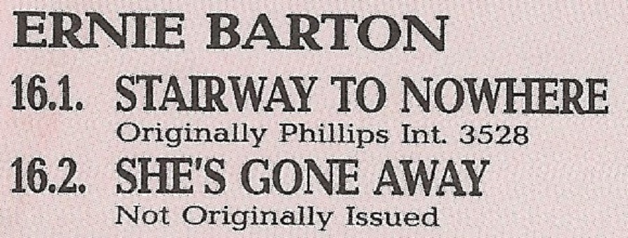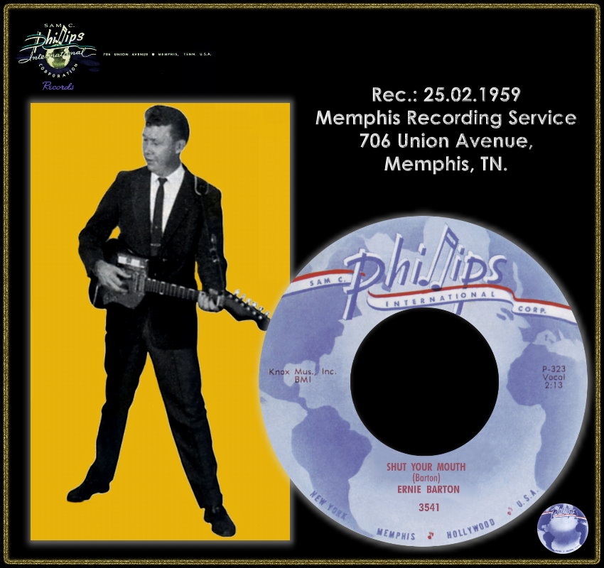 Ernie Barton veröffentlicht seit 1958 auf Phillips International, Studio-Musiker u.a. Roland Janes-g, Sid Manker-g, Billy Riley-b, J.M. Van Eaton-d, Jimmy Wilson-p, Charlie Rich-p, Martin Willis-tsax