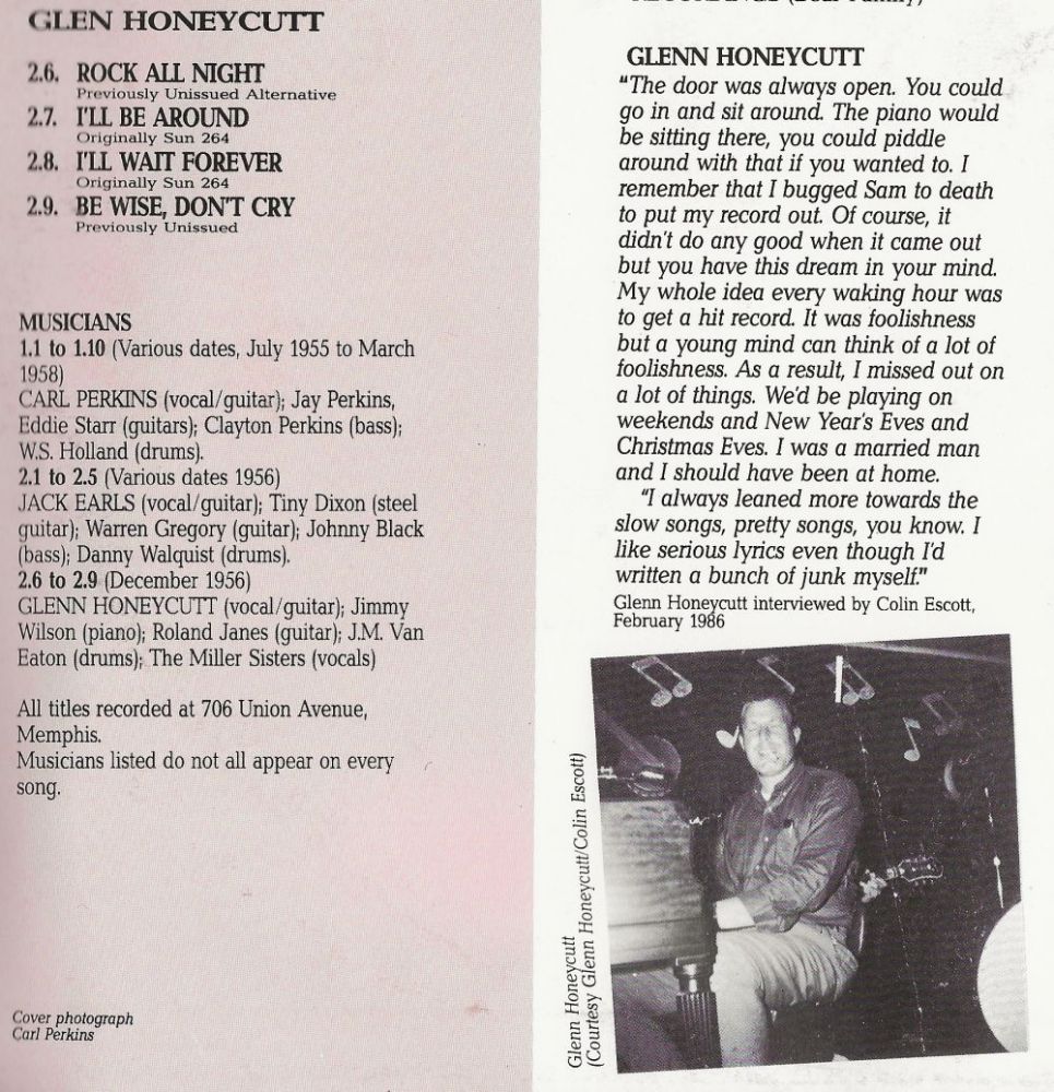 Glenn Honeycutt, erste unveröffentlichte Titel seit April 1956, Session 28. Dezember 1956 für Sun 264: Glenn Honeycutt-vocal, g, Roland Janes-g, J.M. van Eaton-d, Jimmy Wilson-p, The Miller Sisters-vocal, weitere Titel aus 1958 blieben ohne Veröffentlichung