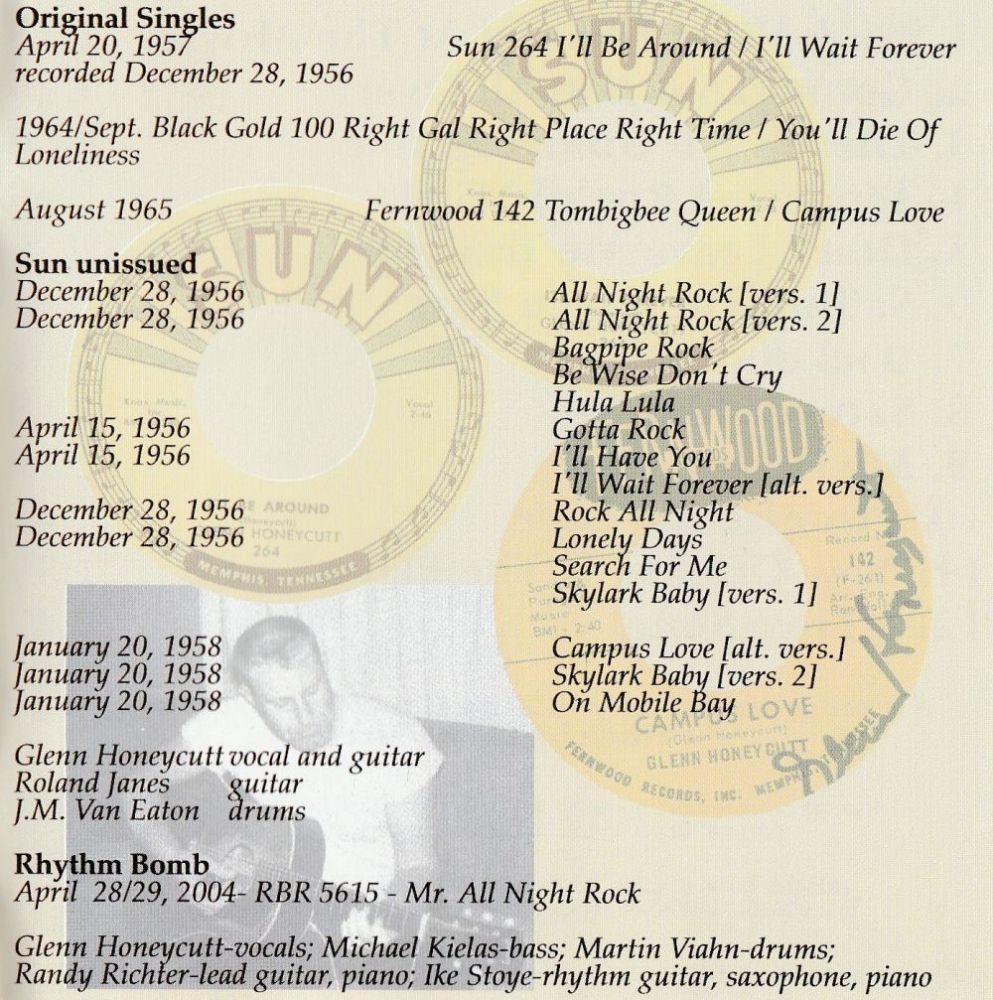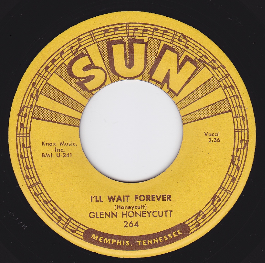 Seit Frühjahr 1956 trat Glenn Honeycutt mit seinen Band-Kollegen (?) bei Sam Phillips zur Aufnahme von insgesamt sechs Titeln an, die wie so oft es Praxis bei Sam Phillips war, unveröffentlicht blieben. Erst im Dezember 1956 wurden in einer 3. Session die Titel “I’ll Be Around“ und “I’ll Wait Forever“ aufgenommen, die auf Sun 264 am 23. januar 1957 veröffentlicht wurden. Weitere zwei Titel (“Rock All Night“ und “Lonely Days“) blieben wieder im Archiv liegen. Die Aufnahmen wurden von dem gestandenen Sun-Sessionpersonal (s.o.) unterstützt. “Rock All Night“ (?) wurde 1978 auf Sun 617 veröffentlicht. Das war’s bei Sun Records.