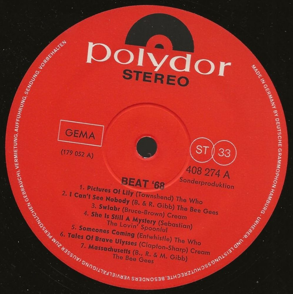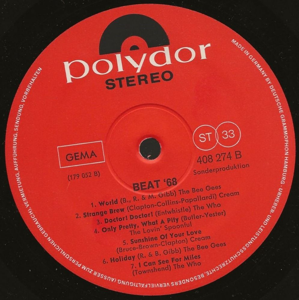 Diese Vorgehensweise ist ja bekannt von den Club-Ausgaben für Bertelsmann und andere, und auf den ersten Blick könnte man "Beat 68" auch für eine der üblichen Club-LPs halten. Aber wie gesagt, die Bestellnummer... sechsstellig mit 4 beginnend, dieser Bereich war (von wenigen Ausnahmen wie z.B. Polydor International abgesehen) den Platten für die Siemens-Leute vorbehalten. Organisatorisch wurden diese Platten ähnlich wie Club-LPs behandelt, nämlich wie Lohnpressungen. Daher hat auch die abgebildete Platte auf dem Label eine kleingedruckte Lohnpress-Nummer, die gleichzeitig als Matrizennummer dient, in diesem Fall 179052.