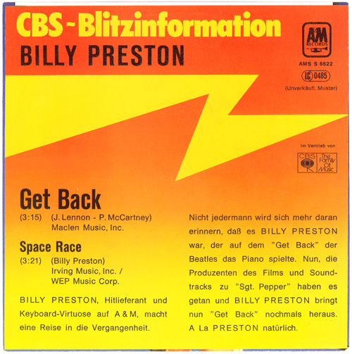 Billy Preston war der erste Musiker, der für seine Mitwirkung bei einer Aufnahme der Beatles namentlich benannt. Und das auch noch auf dem Cover der Singleauskopplung von Get back !