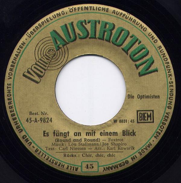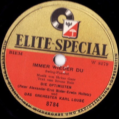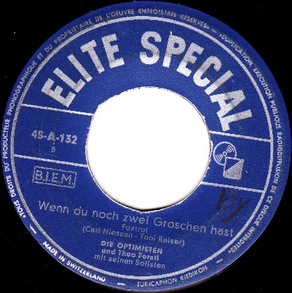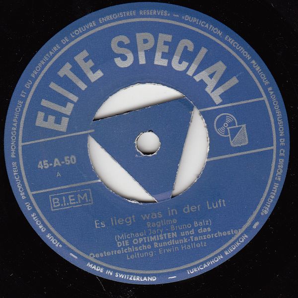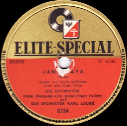 OPTIMISTEN, Die (ERNI BIELER, ERWIN HALLETZ, PETER ALEXANDER, später JÖRG MARIA BERG, RUDI HOFSTETTER o. RUDI KREUZBERGER-ab Mai 1957), Gesangsensemble, Elite-Special, Austroton, Januar 1954 Start der großen Deutschlandtournee der Austroton "Schlagerexpress Wien-Berlin" (Gastspieldirektion Heinz Hoffmeister in Verbindung mit der Konzertdirektion Europa GmbH, Wien), als PETER ALEXANDER, bis dato das beste Pferd im Stall der Wiener Austrophon–Produktion, nicht mehr kontinuierlich zur Verfügung stand, bildeten JÖRG MARIA BERG und auch zeitweise RUDI KREUZ-BERGER zusammen mit ERNI BIELER u. ERWIN HALLETZ das Gesangstrio, das bis 1957 Schallplatten bei Austrophon veröffentlichte, 12 Titel davon mit der Stimme von JÖRG MARIA BERG, zwei weitere Titel im Mambo-Rhythmus wurden zunächst als 5 MAMBOS aufgenommen, dann jedoch als OPTIMISTEN-Schallplatte in den Handel gebracht, LP Jodelvox 1292