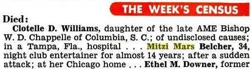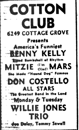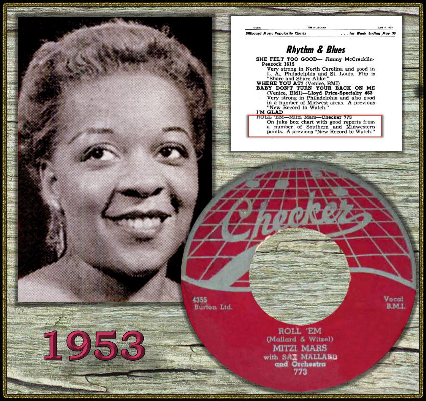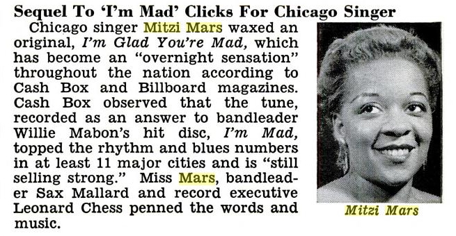Ms. Mars was a brassy nightclub singer, who often made her appearances wearing a blond wig. She had been on the South Side club scene since at least 1951, when she made an extremely obscure record for JOB with Henry Palmer and his Boys. Unfortunately, the songs she was given to sing on that occasion were incredibly inane, dated Swing numbers. An answer song to "I'm Mad" was much better suited to her, and "Let It Roll" (on which Ms. Mars employs an Eartha Kitt-like device, stretching "roll" out into "rolllll-a"), builds up some considerable momentum. Expert backing was supplied by Sax Mallard (playing tenor sax on this R&B date) and his quartet.